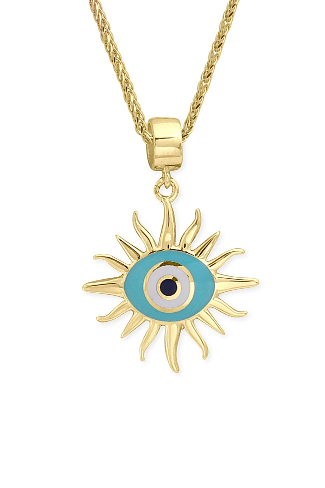14 Ayar altın 4.35 gram ağırlığında şık ve gündelik kullanıma uygun 3 cm boyunda turkuaz mineli göz modeliyle olduça şık bir duruşa sahip nazar güneş kolye.