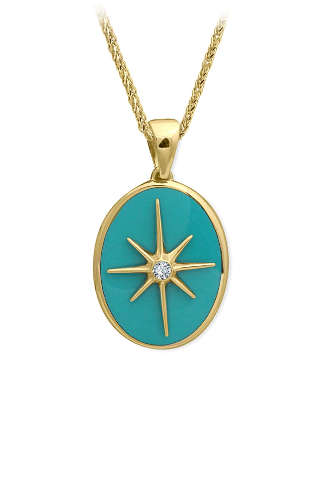 Farklı havaya sahip turkuaz mineli tasarım 7.30 gr. 3.5 cm boyutunda kuzey yıldızı model 14 ayar altın oval model madalyon kolye.