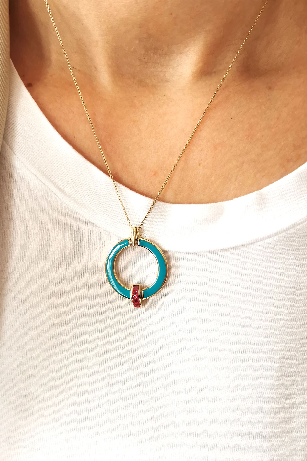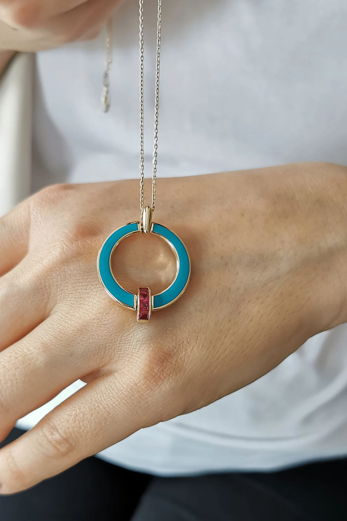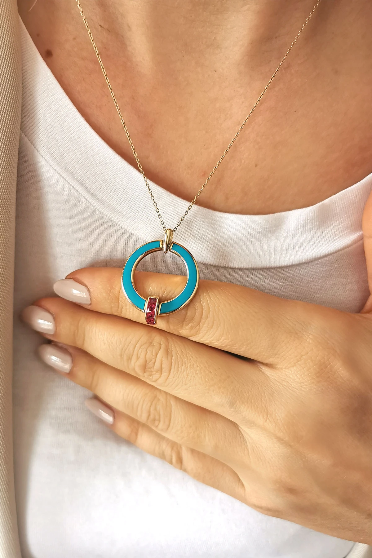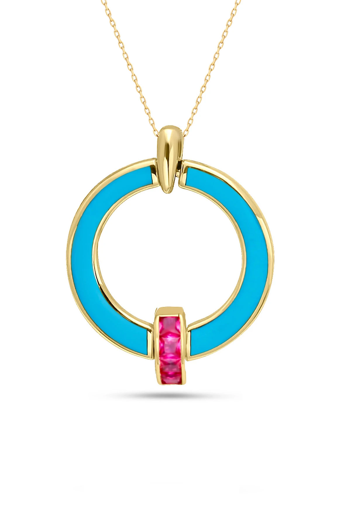 6.40 gr. 3 cm boyutunda şık ve modern bir tasarıma sahip turkuaz mineli zirkon ruby taşlı altın kolye.
