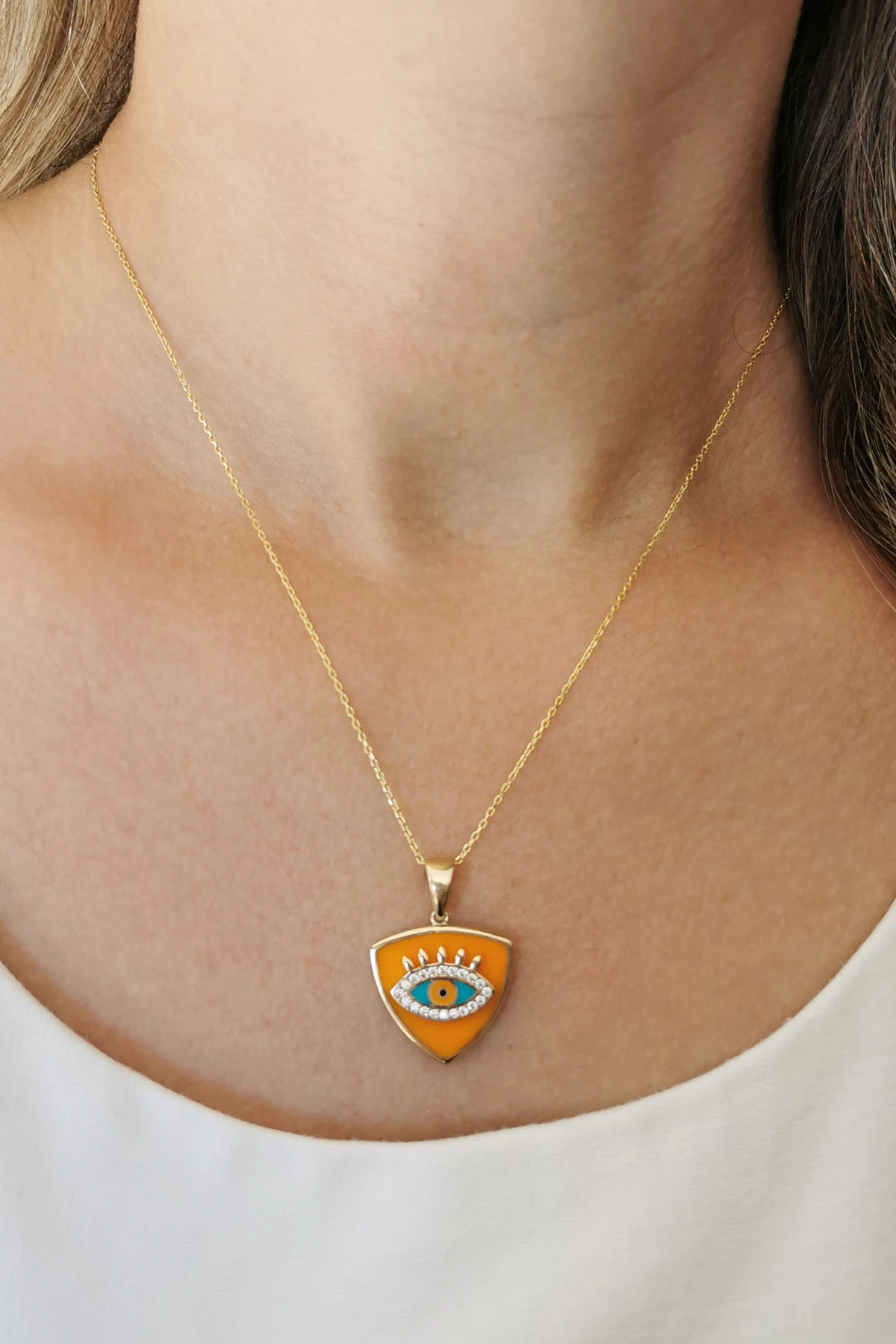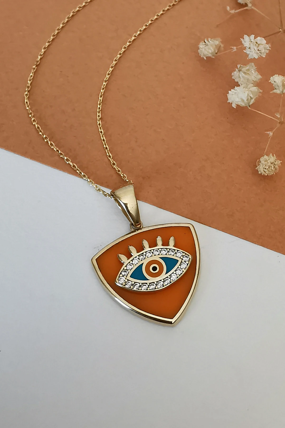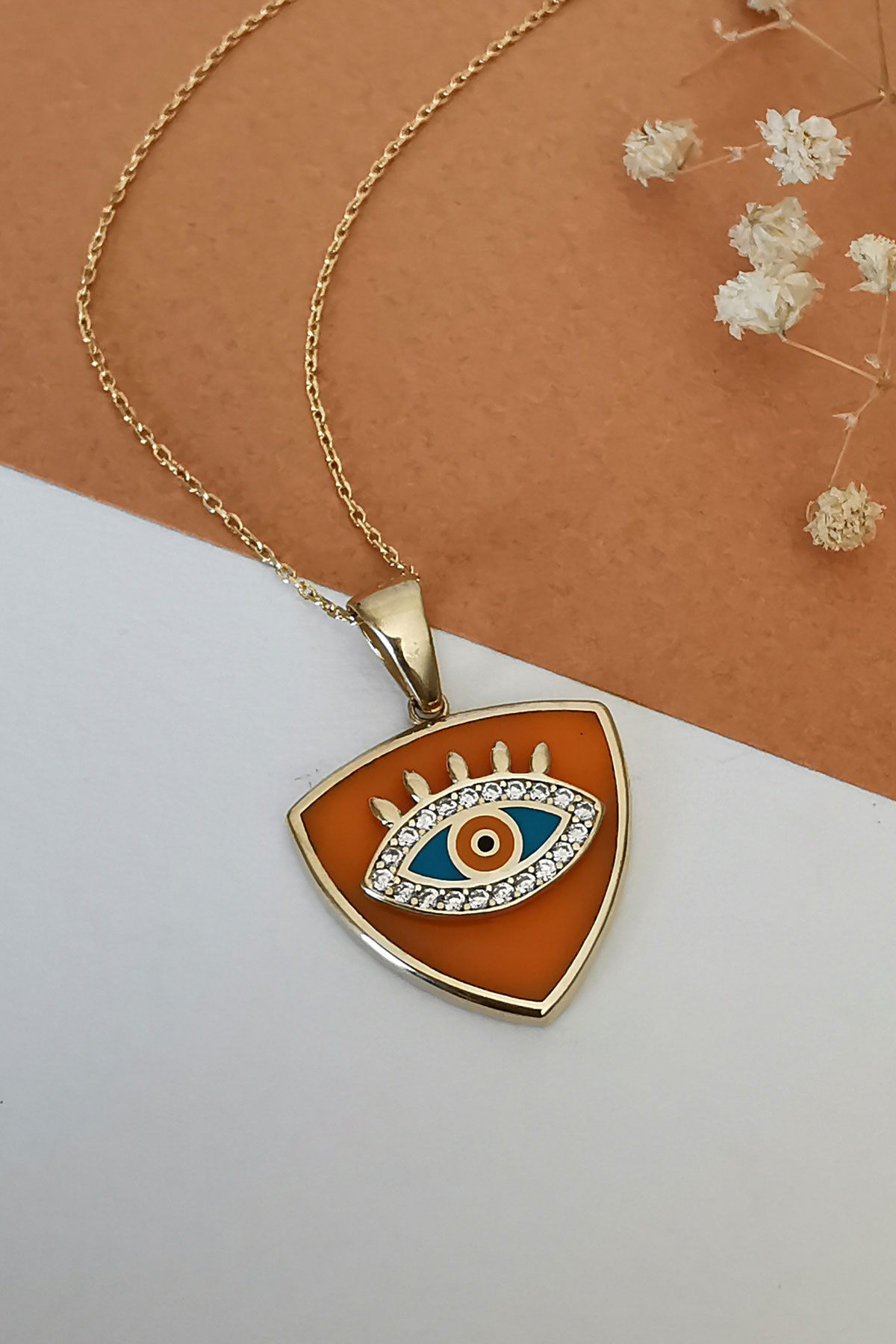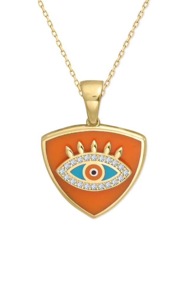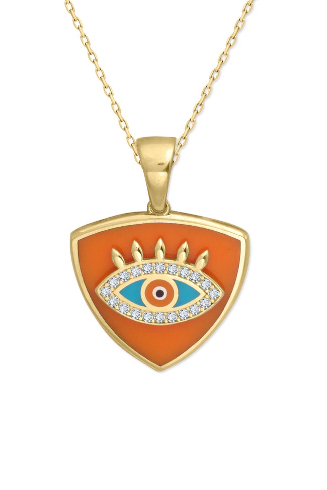 6 Gr. 3 Cm boyutunda turuncu mineli üçgen model 14 ayar altın kolye.