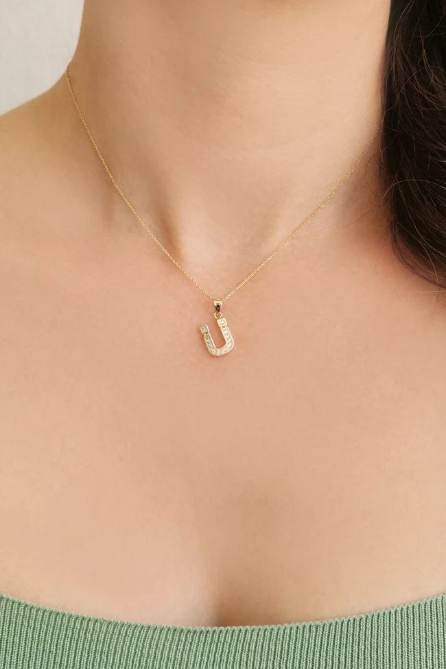 14 Ayar Altın Ü Harfi Zirkon Taşlı Sade Tasarım Kolye.