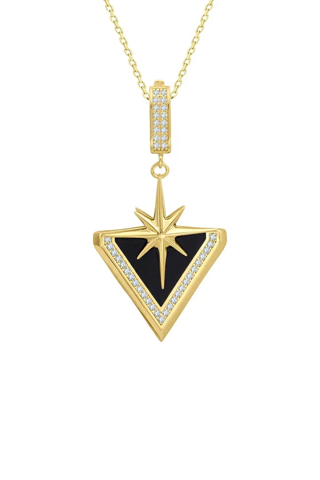 14 Ayar altın 5.60 gram ağırlığında şık ve gündelik kullanıma uygun 3.5 cm boyunda siyah mineli üçgen model yıldız kolye.
