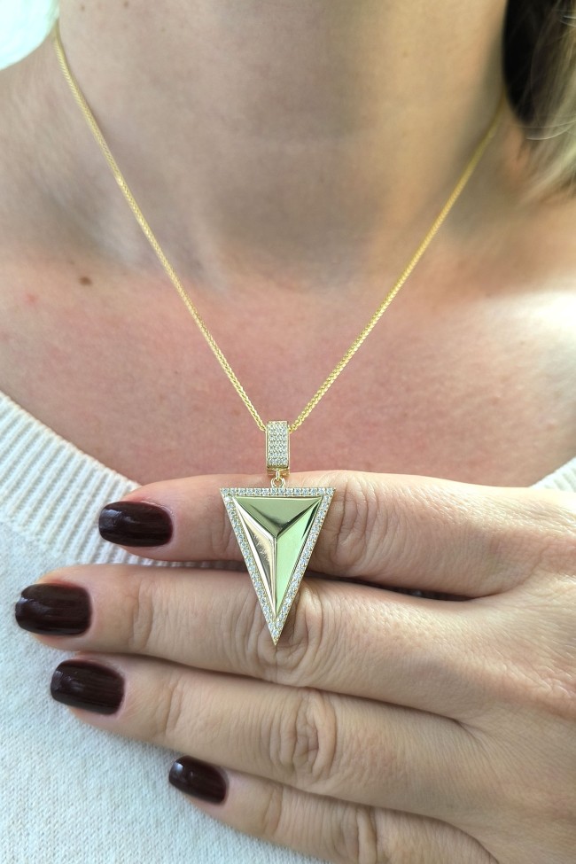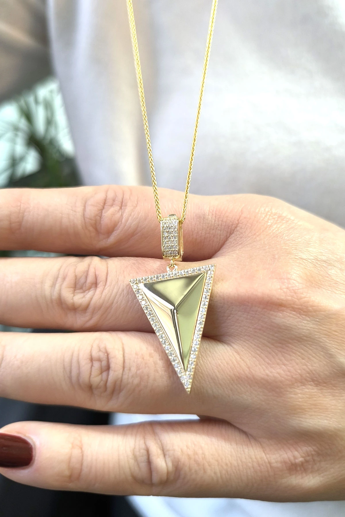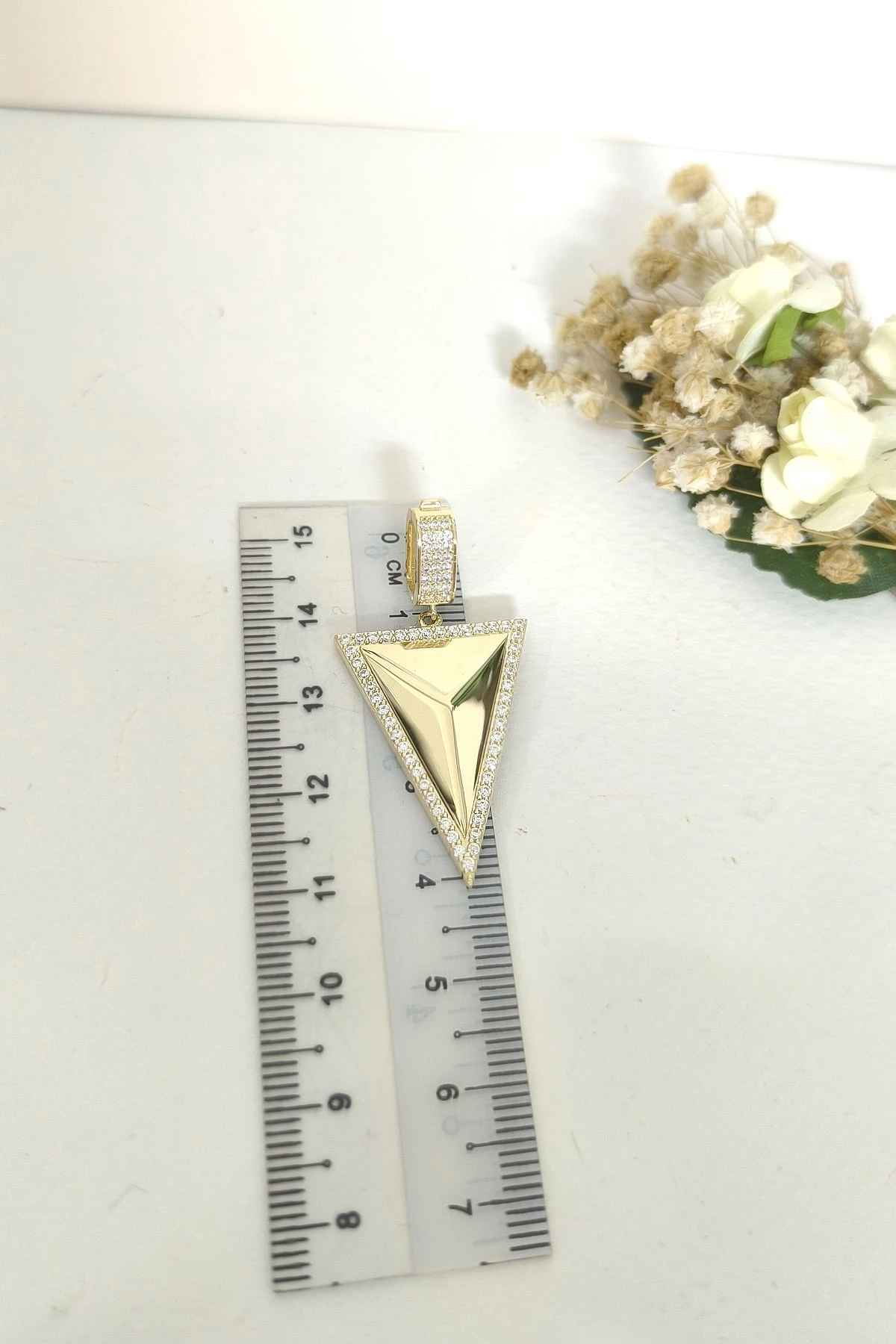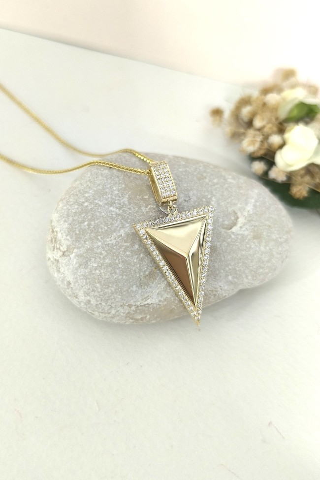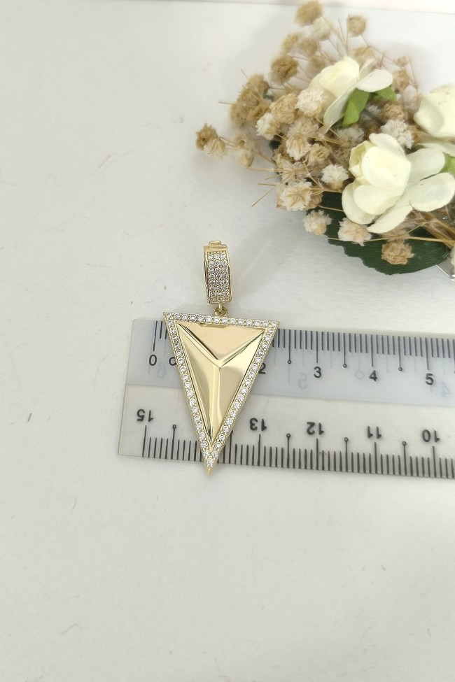 5.90 gr. 4 cm boyutunda zirkon taşlı model 14 ayar altın üçgen plazma boyutlu model charm kilit kolye. Farklı kolyelerinizle bir arada kombine olarak kullanabileceğiniz harika ve gösterişli bir model.