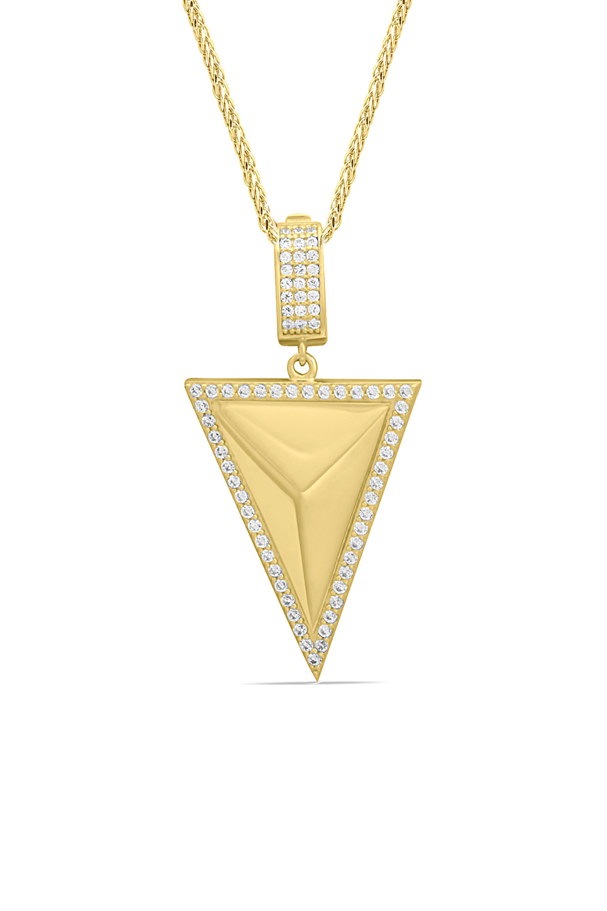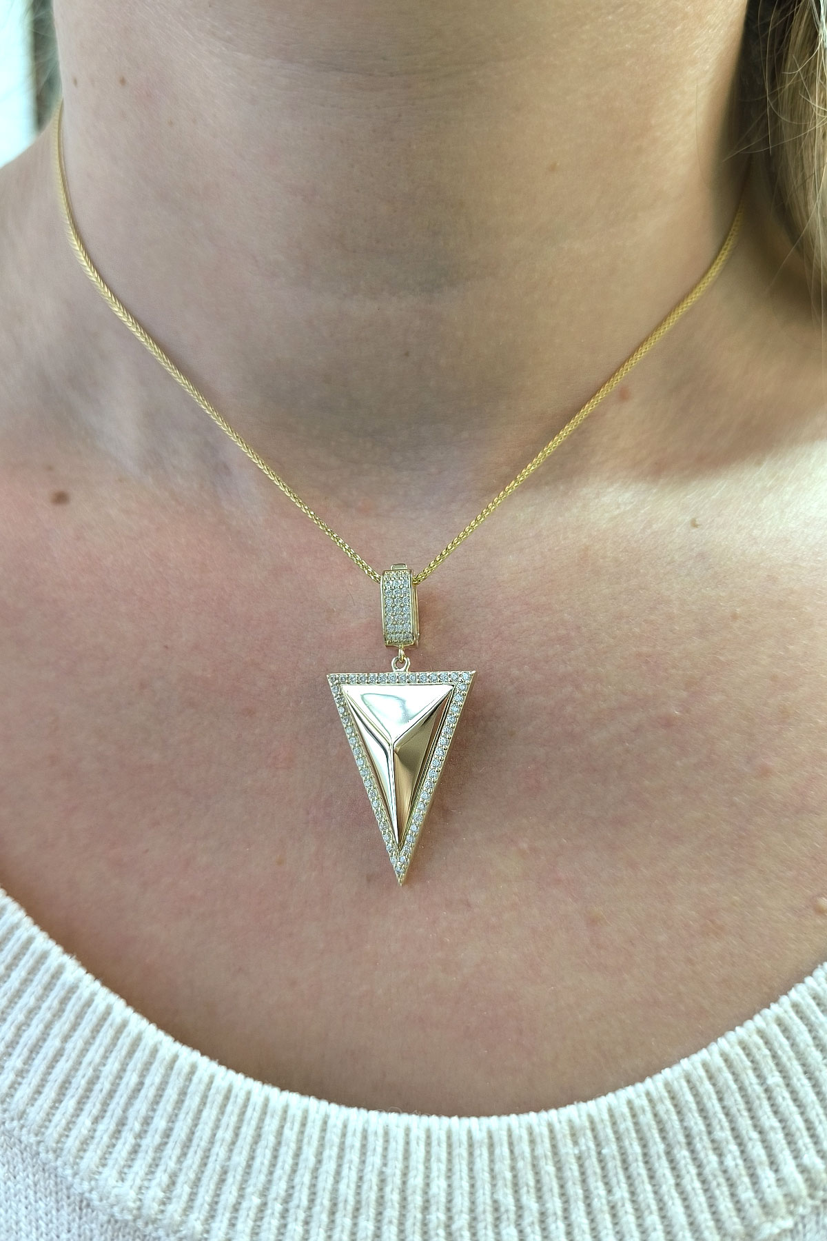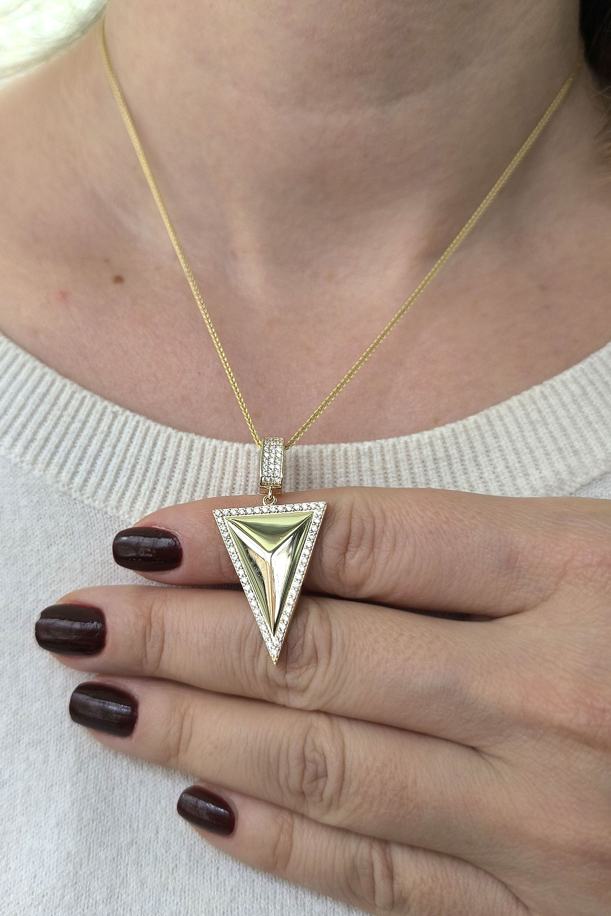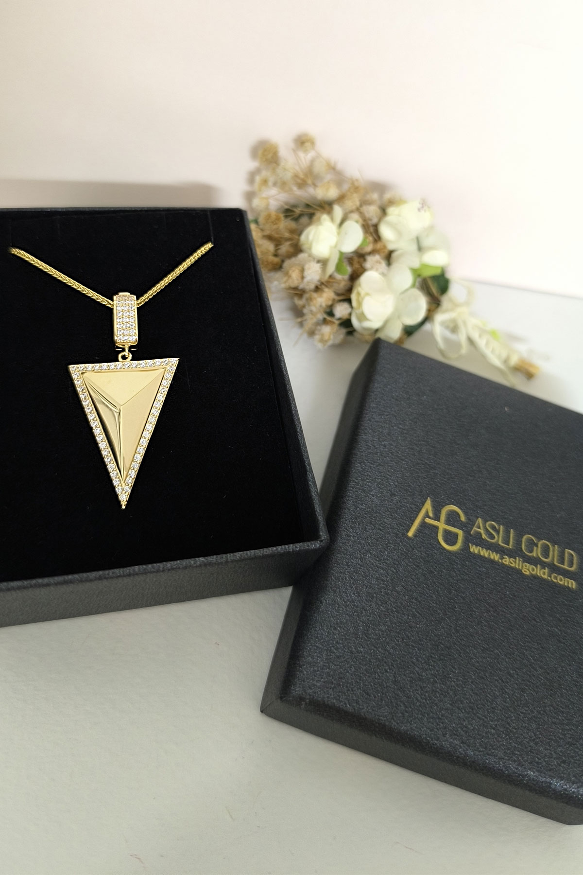 5.90 gr. 4 cm boyutunda zirkon taşlı model 14 ayar altın üçgen plazma boyutlu model charm kilit kolye. Farklı kolyelerinizle bir arada kombine olarak kullanabileceğiniz harika ve gösterişli bir model.