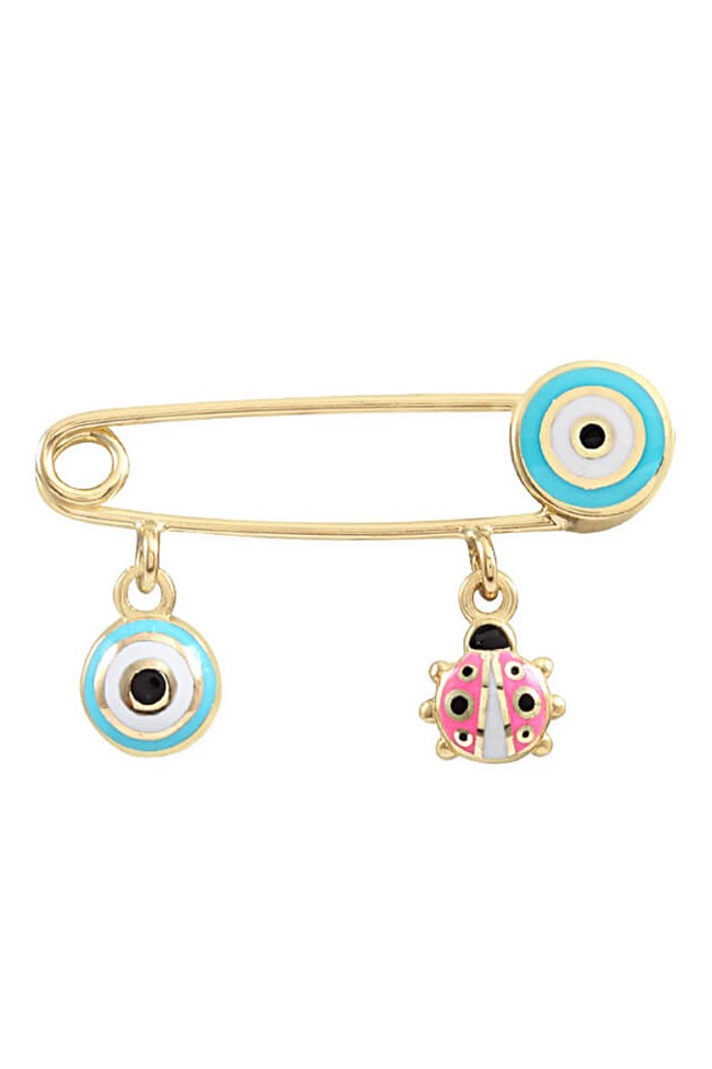 2.5 Cm boyunda isterseniz seçime bağlı olarak isim yazılı yada isimsiz satın alabileceğiniz 14 ayar 2.00 gr ağırlığında altın nazar detaylı uğur böcekli çocuk iğnesi.