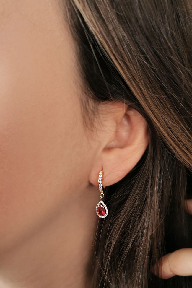 3.00 Gram Ağırlığında 2.5 Cm Damla Model Zirkon Yakut Kırmızı Taşlı Günlük, Modern Ve Şık Bir Duruşa Sahip 14 Ayar Altın Tasarım Küpe.