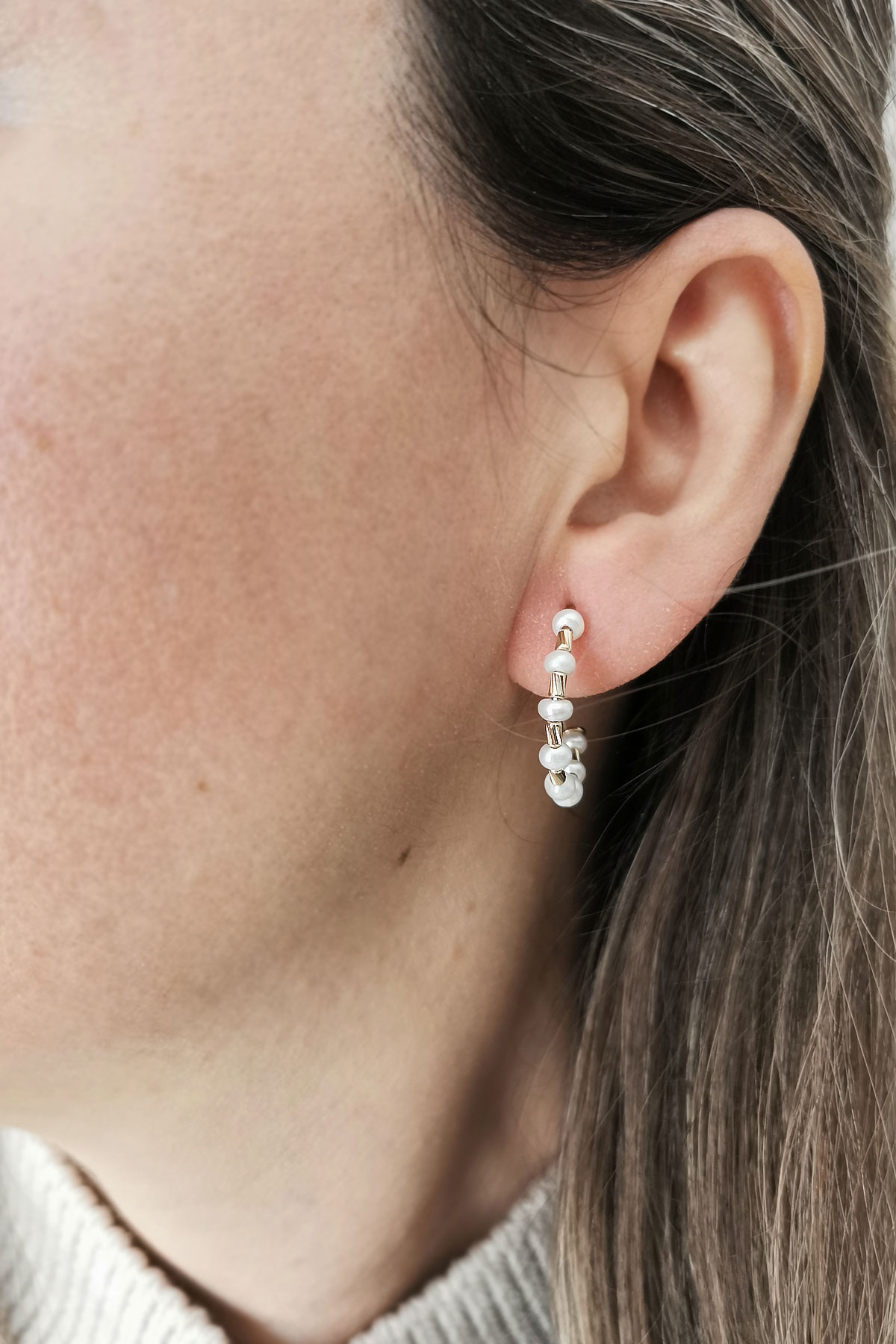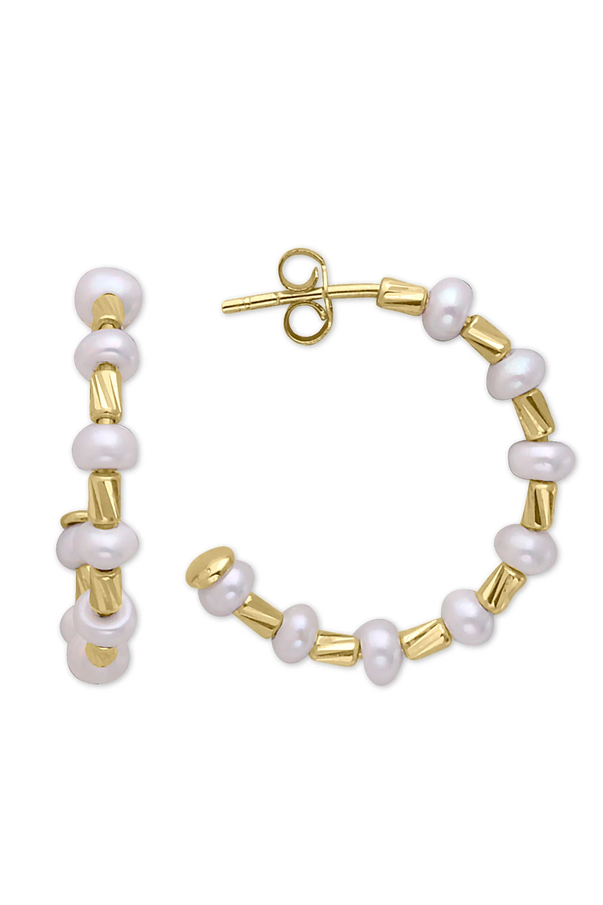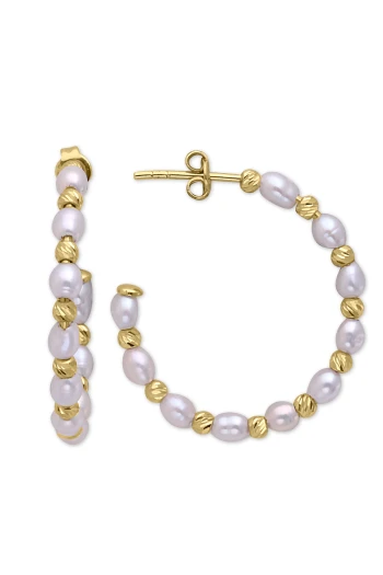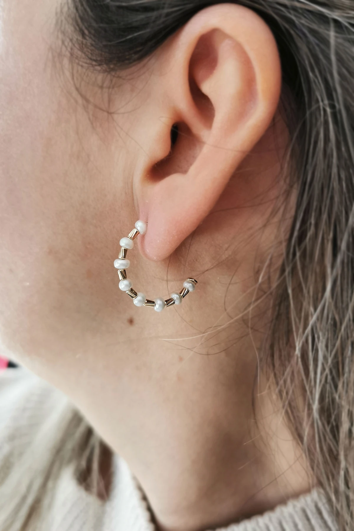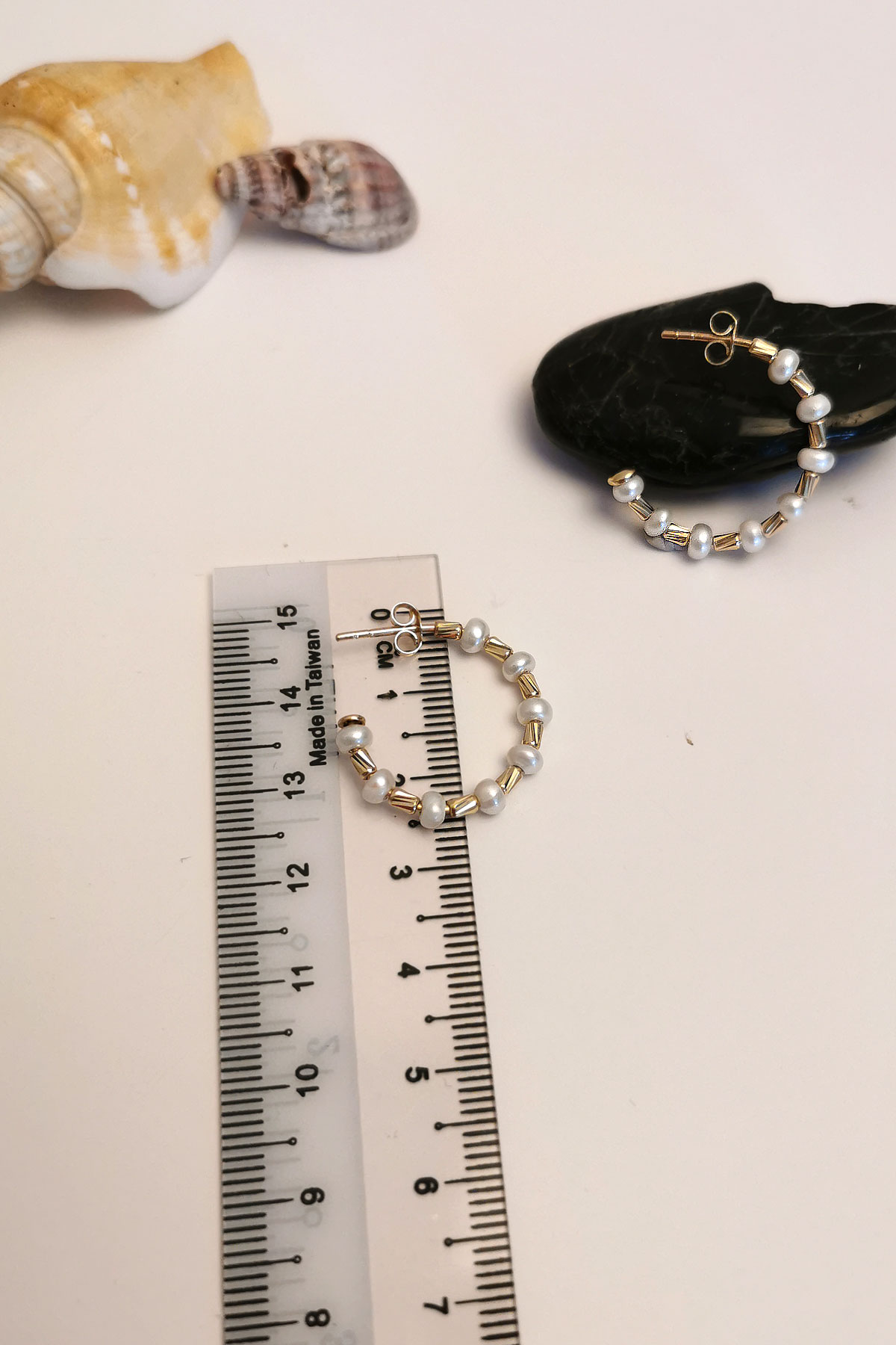2.60 Gram Ağırlığında 2.5 Cm 14 Ayar Yarım Halka İnci Ve Top Detaylı Minimal Vidalı Altın Küpe.