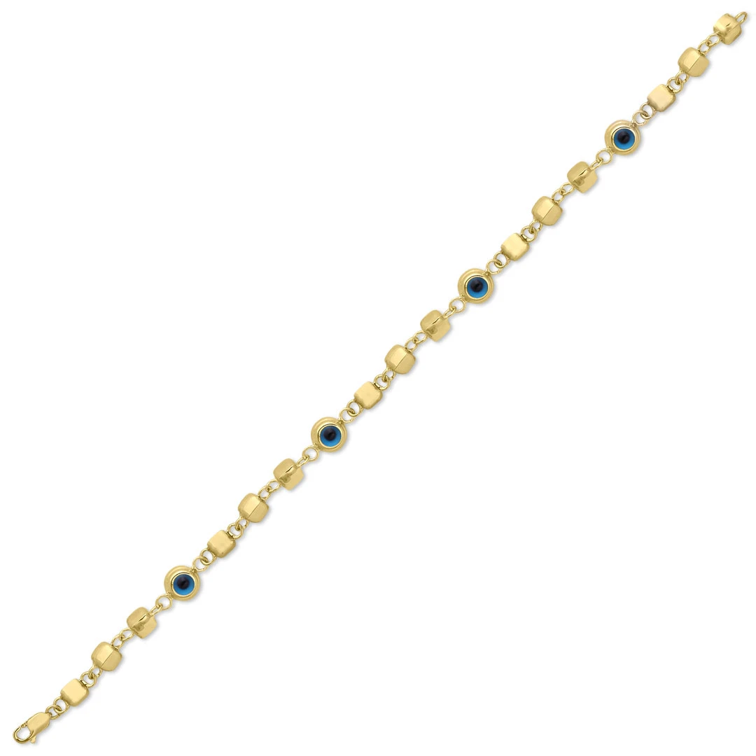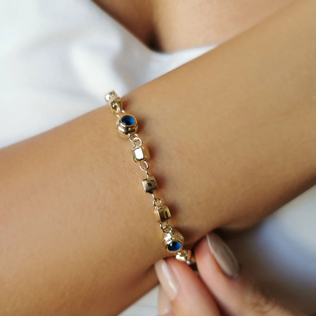 19 Cm boyunda ara parçaları küp detaylı göz tasarımı ile günlük olarak da kullanabileceğiniz, özel günlerinde sevdiklerinize şık bir hediye seçeneği olacak 6.40 gr ağırlığında 14 ayar altın yeni sezon nazar bileklik.