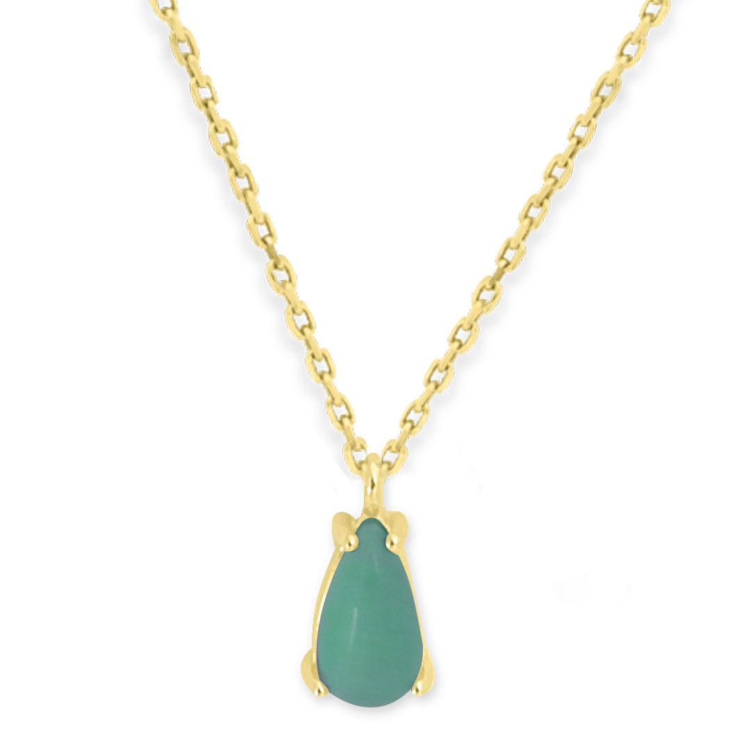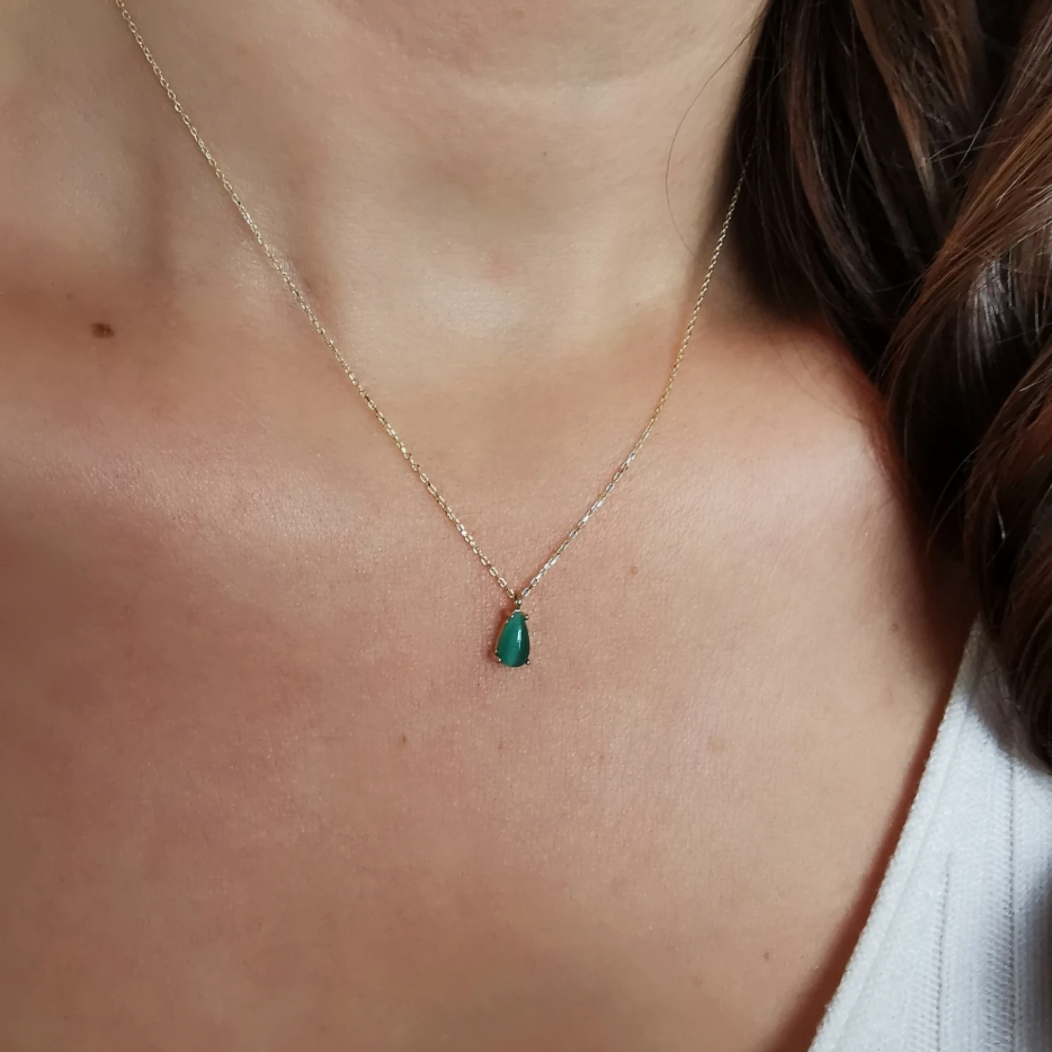 14 Ayar 1.35 gram ağırlığında minimal tasarımıyla gece gündüz boynunuzdan çıkarmak istemeyeceğiniz yeşil taşlı altın su damlası kolye.