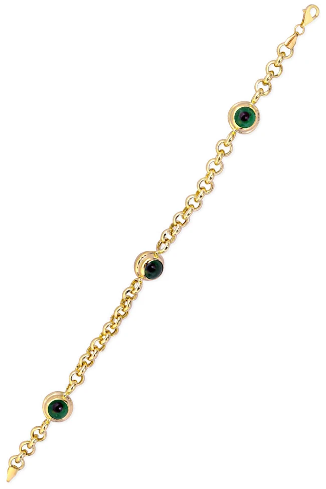 14 ayar altın yeşil nazar boncuklu kendinize yada sevdiklerinize armağan edebileceğiniz tasarım 3'lü iri gözlü doc zincir model ile şık bir tarz yakalayın. Model boyutu 20 cm olup 9.10 gram ağırlığındadır. *Ürünlerimiz faturalıdır güvenle satın alabilirsiniz, özel hediye kutusunda ücretsiz kargo ile gönderilecektir