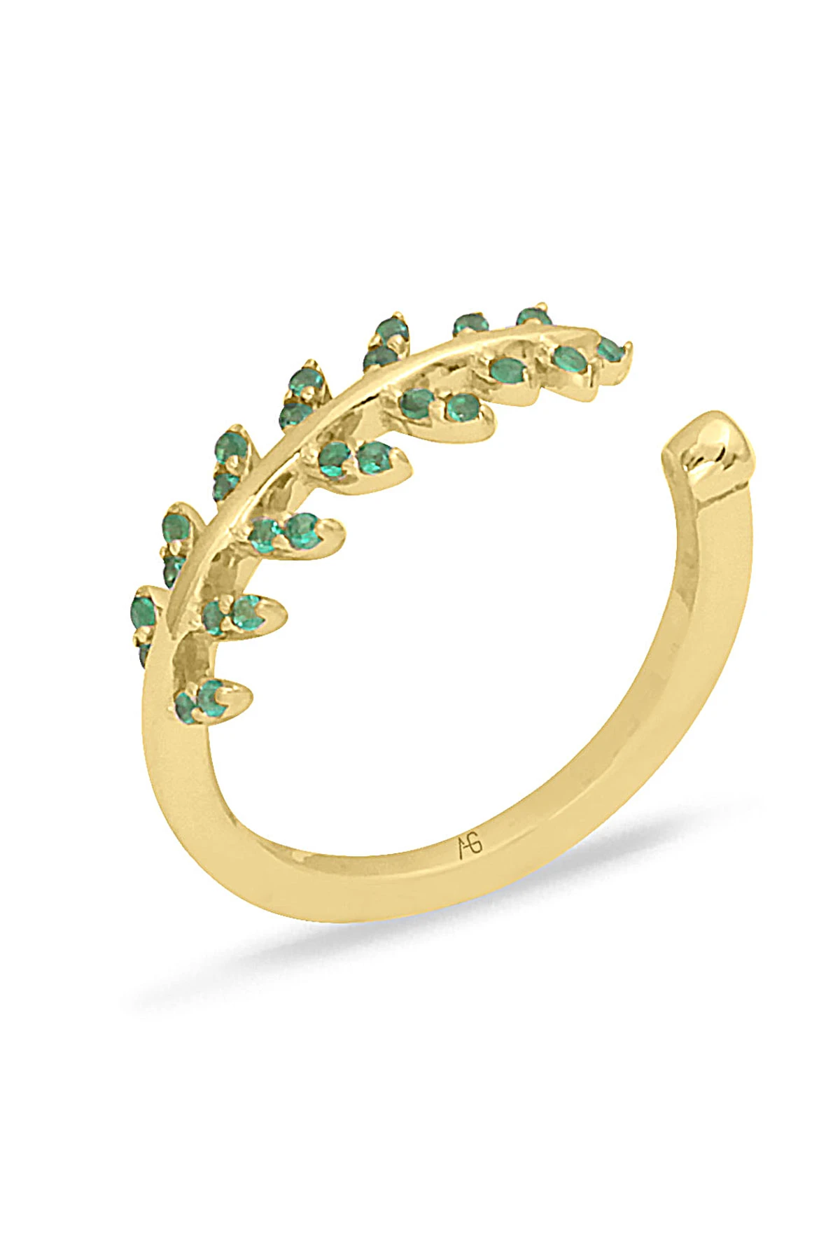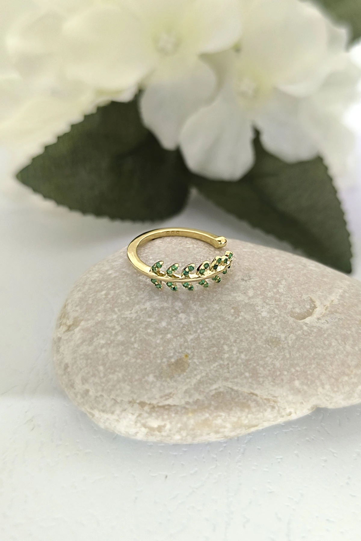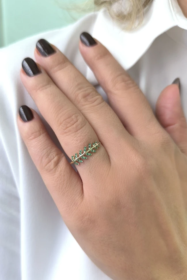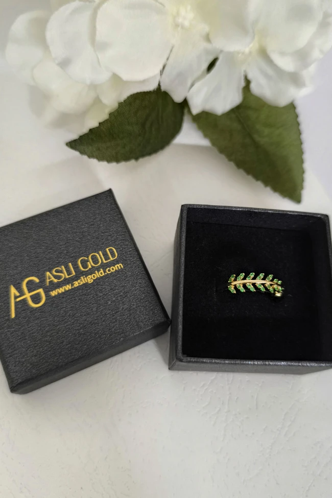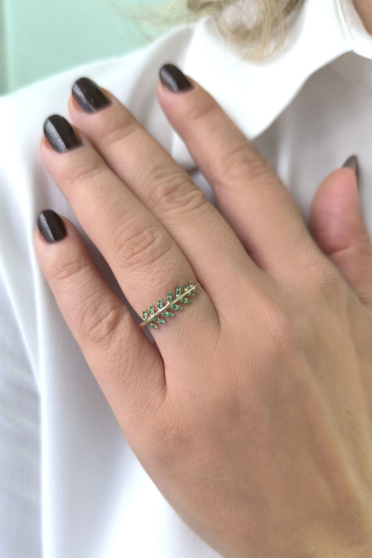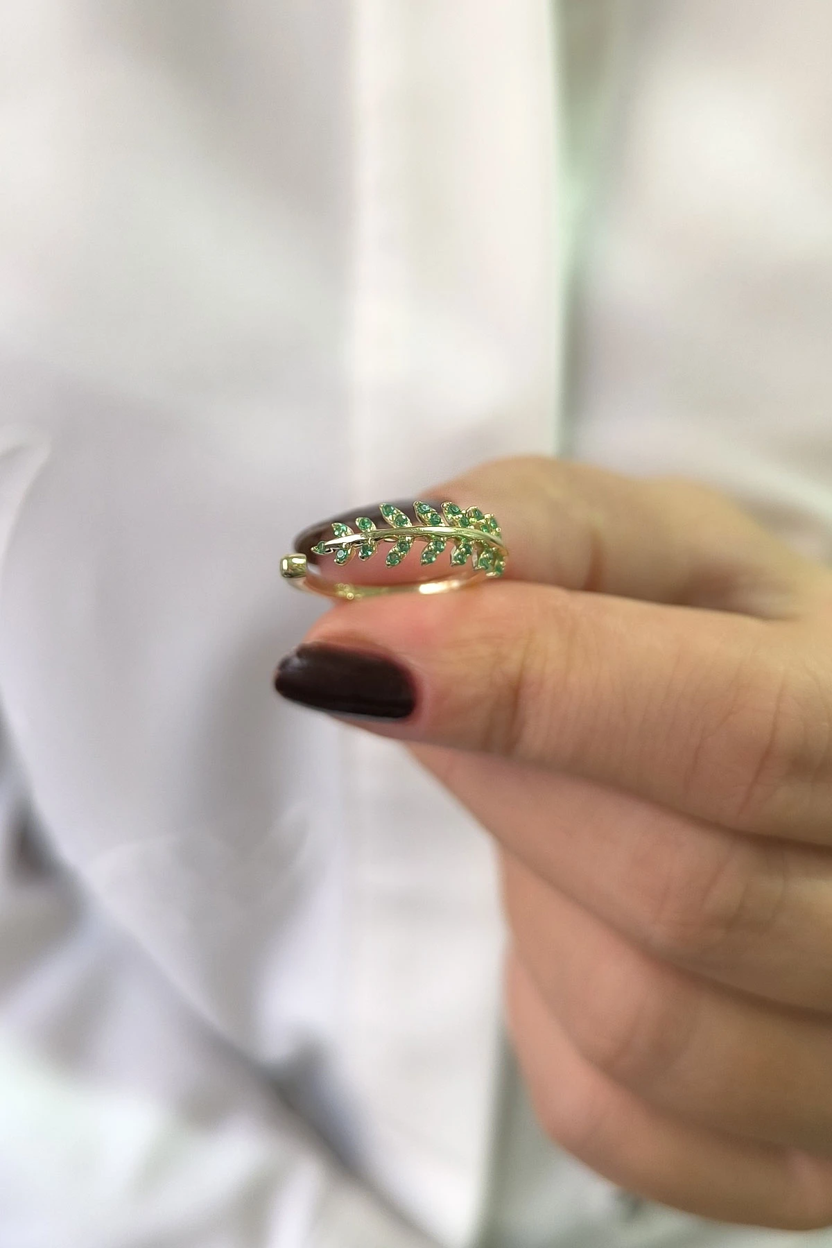 14 ayar sarı altın yeşil zirkon taşlı minimal spor tasarımıyla günlük kullanıma uygun 2.15 gram ağırlığında altın yaprak yüzük.