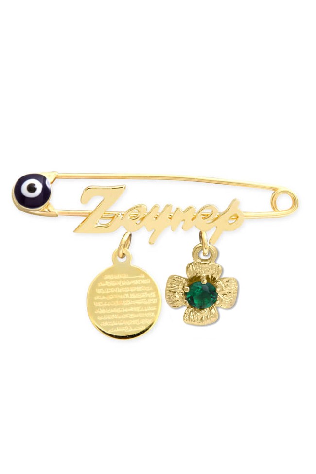 14 ayar 2.20 gr ağırlığında yeşil taşlı çiçek ve ayetel kürsi dualı isimli kız bebek altın iğne.
