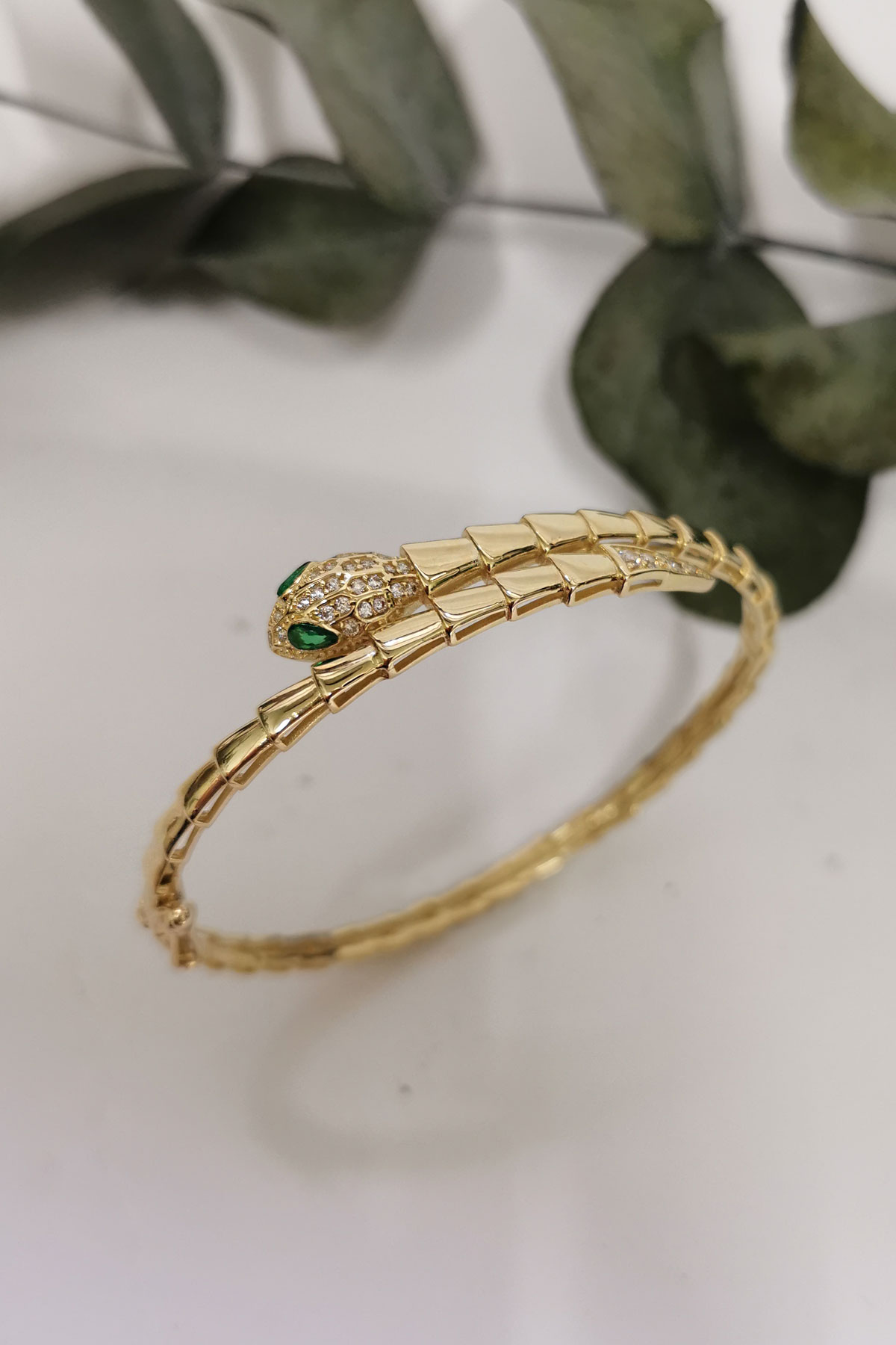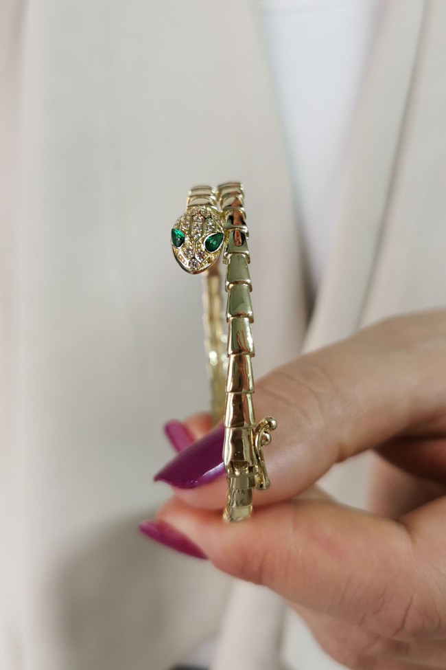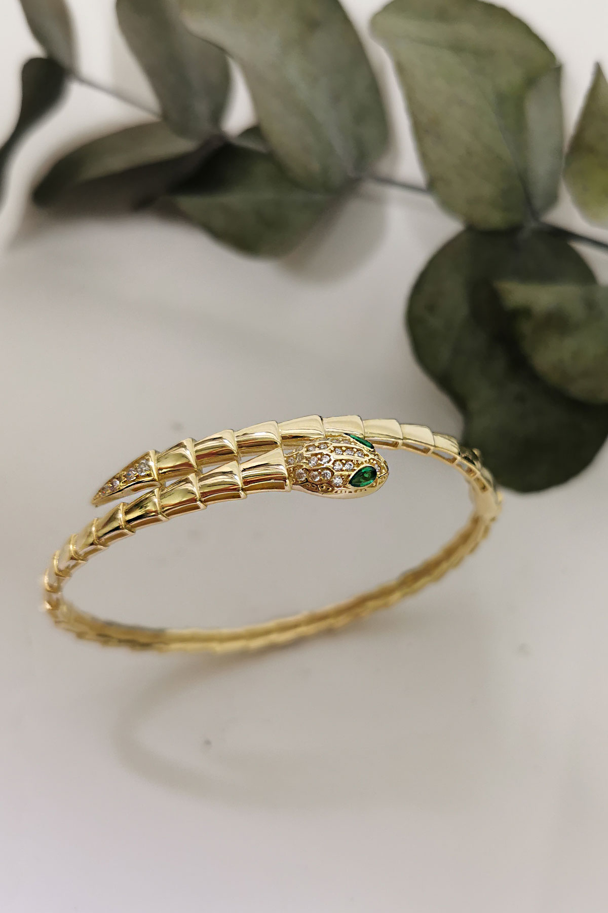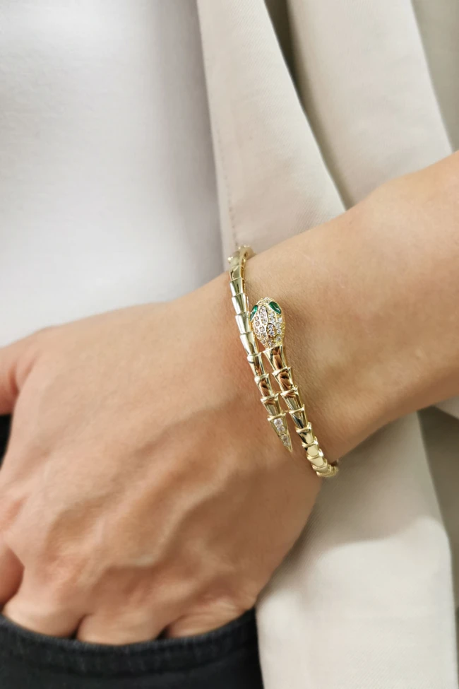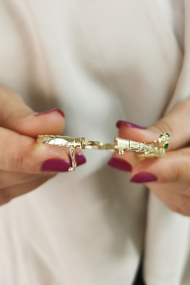 14 Ayar gösterişli ve şık tasarımı ile modern ışıl ışıl duruşa da sahip günlük kullanıma uygun 10.20 gram ağırlığında yeşil göz detaylı yılan model altın kadın bilezik.