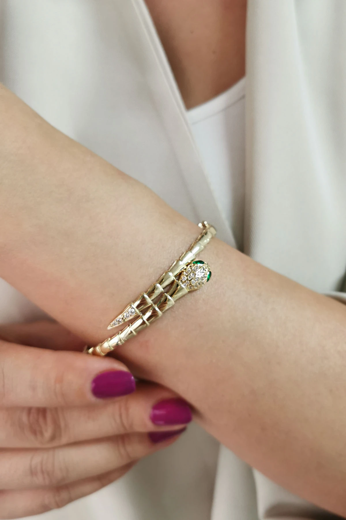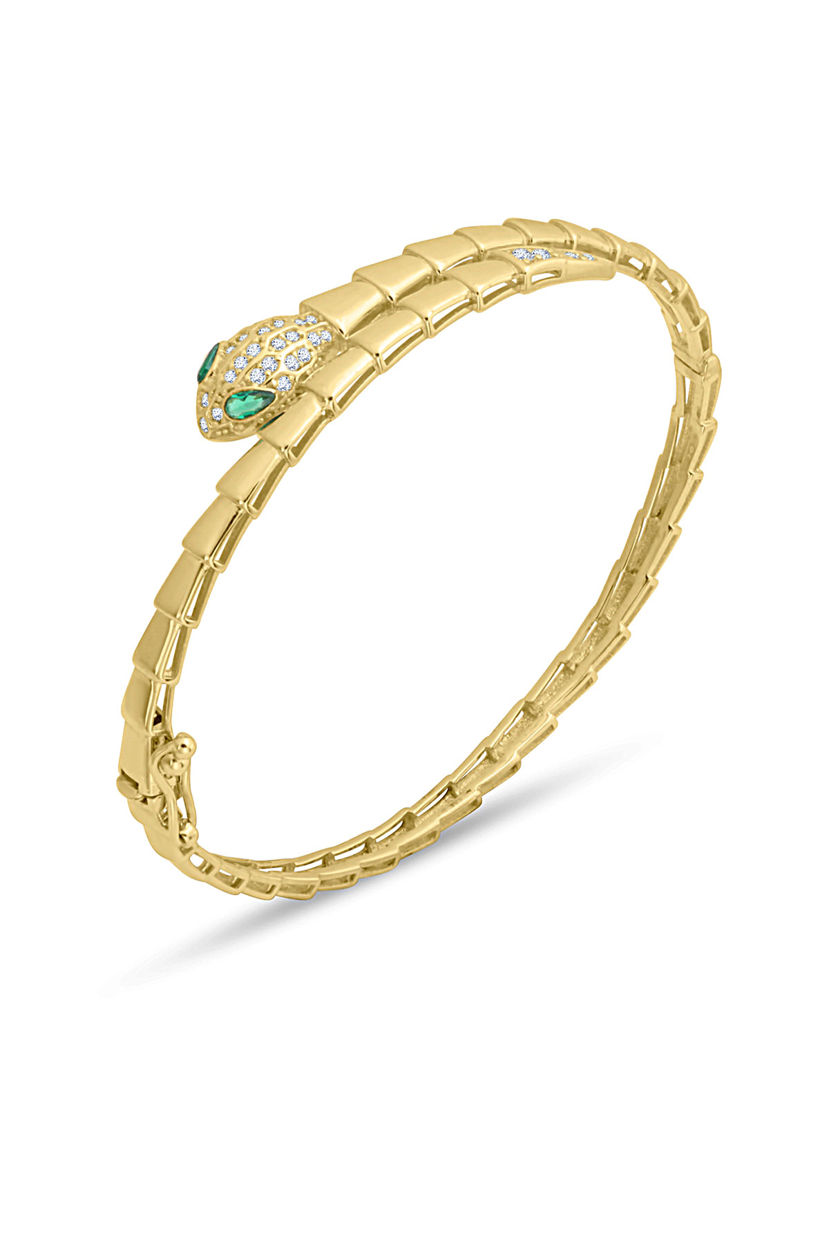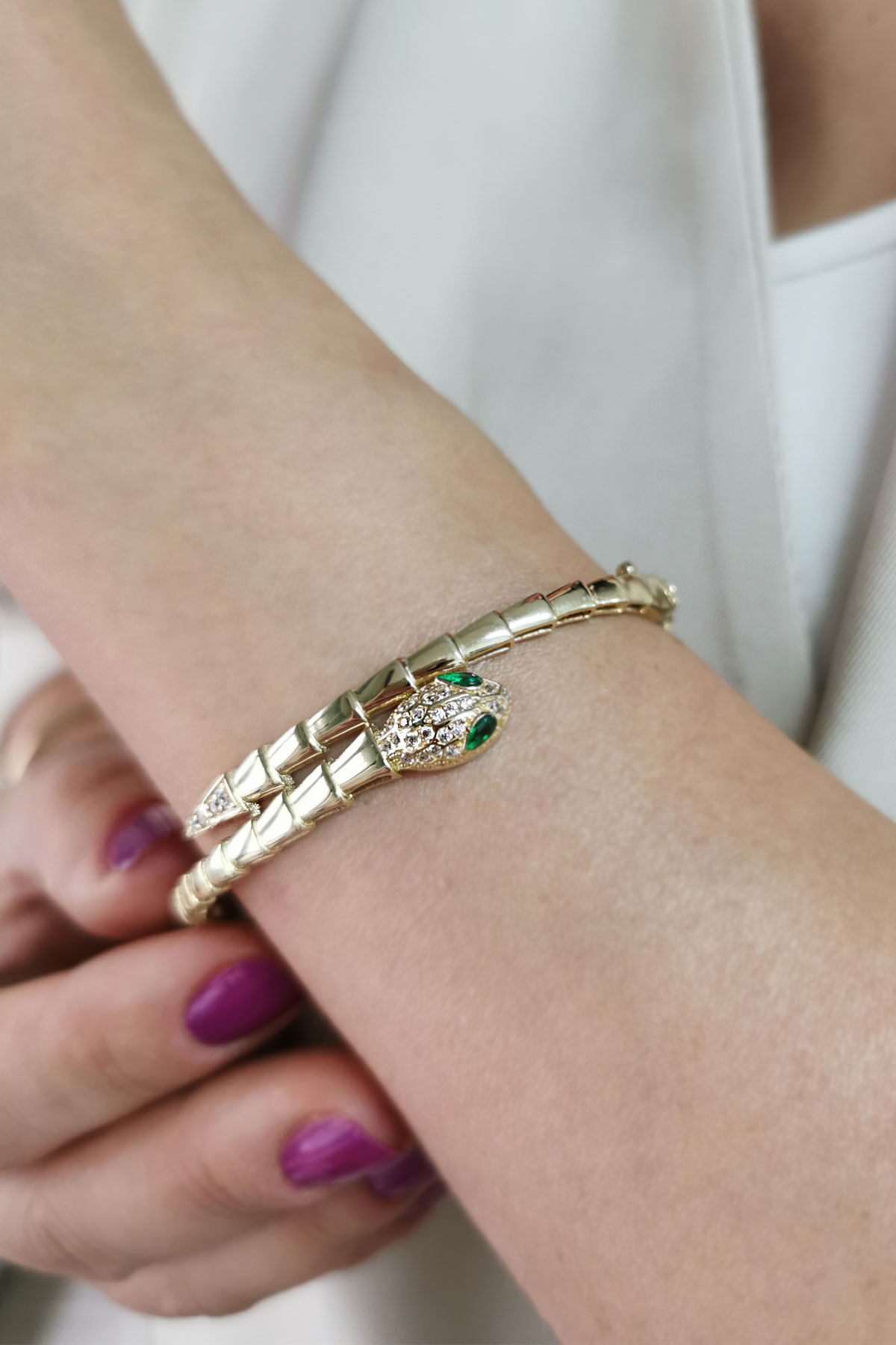 14 Ayar gösterişli ve şık tasarımı ile modern ışıl ışıl duruşa da sahip günlük kullanıma uygun 10.20 gram ağırlığında yeşil göz detaylı yılan model altın kadın bilezik.