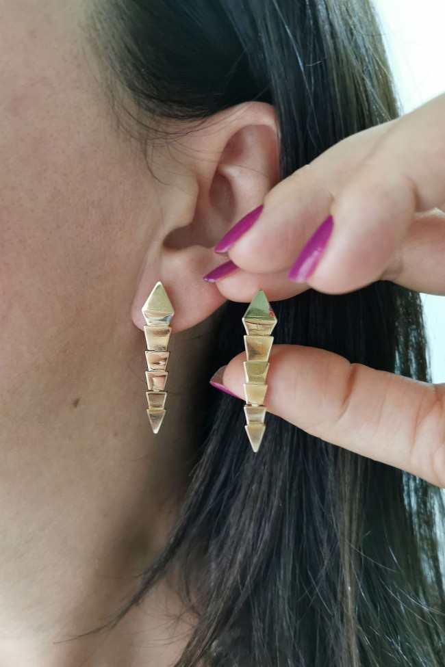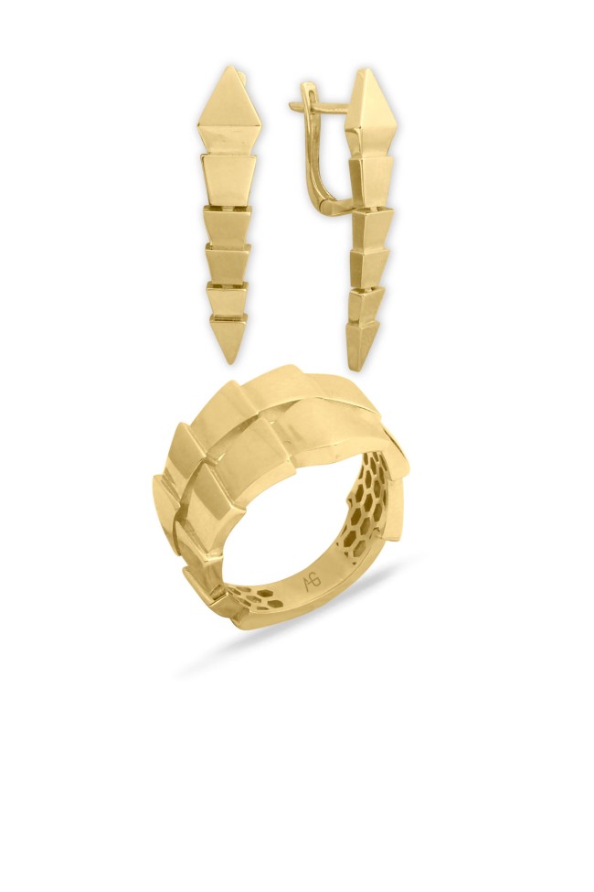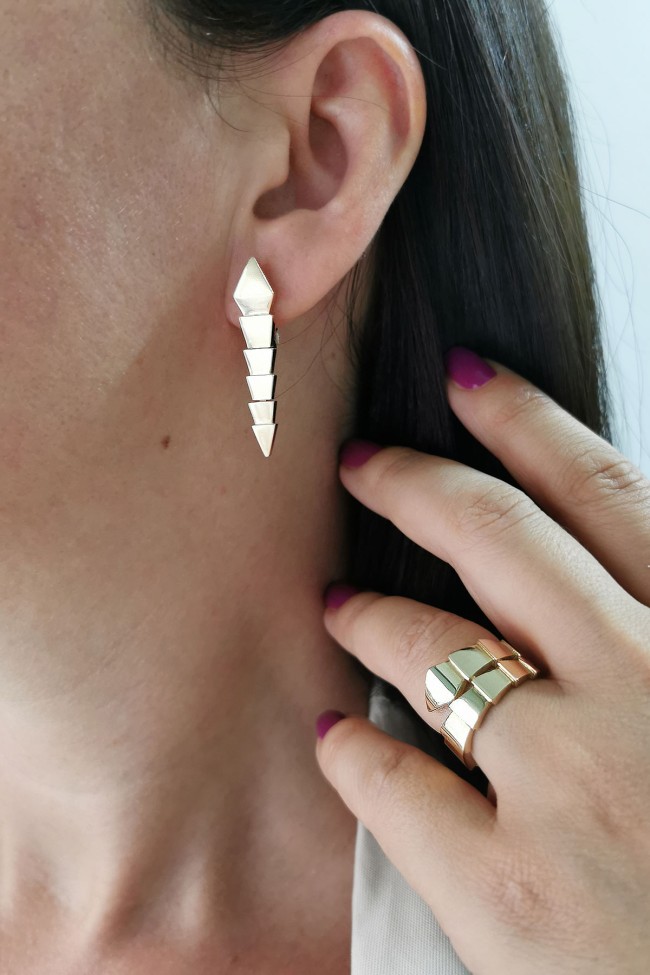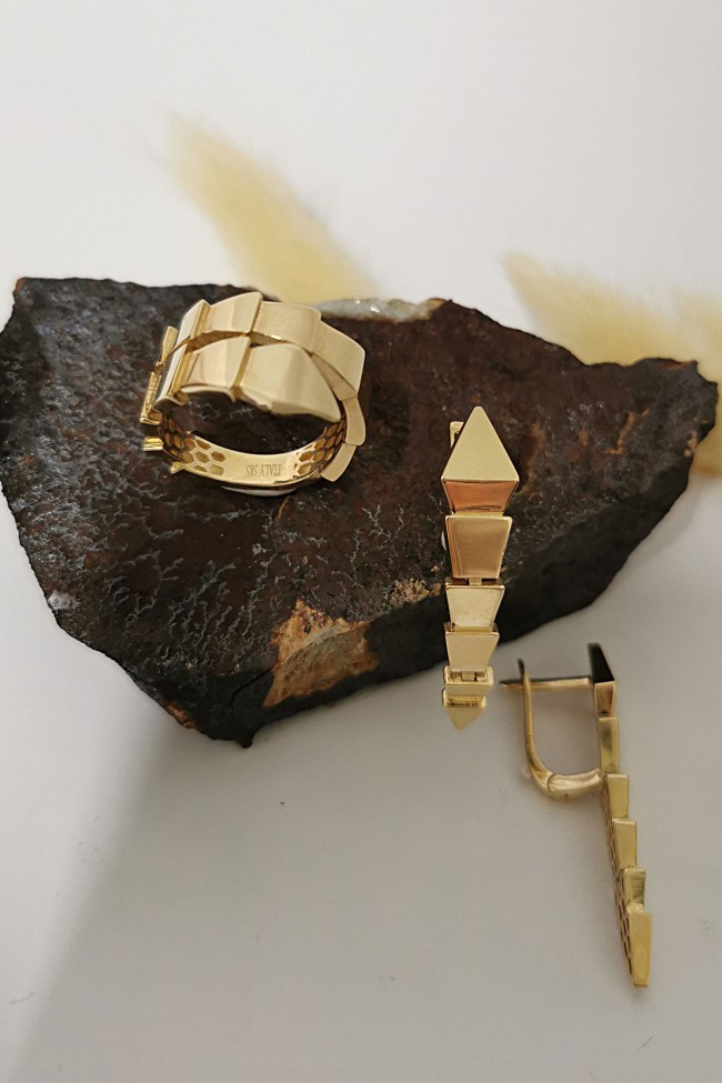 8.90 gram 14 ayar yılan model 3.7 cm boyutunda küpesi ile oldukça farklı ve şık tasarım altın Bulgari yüzük küpe takım.