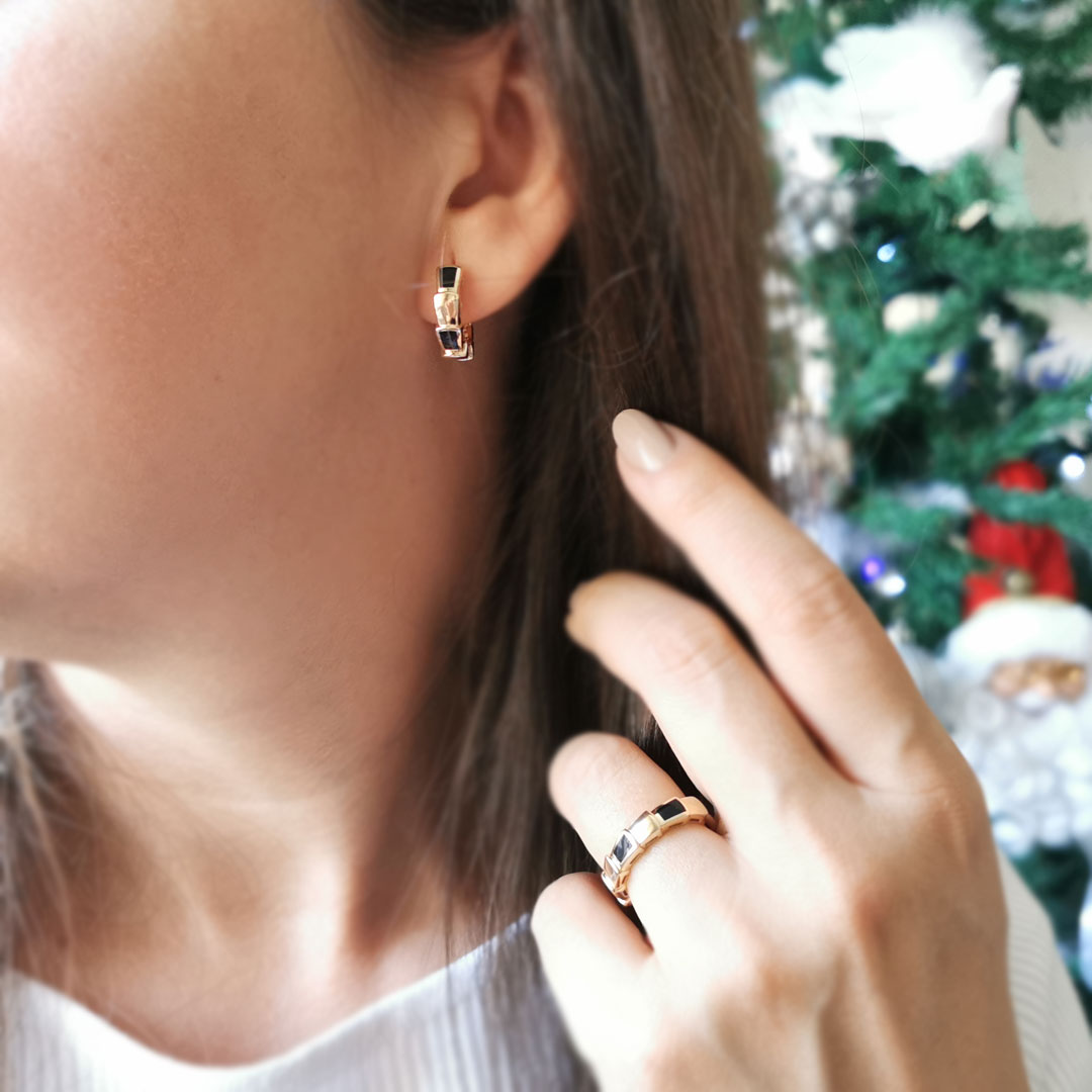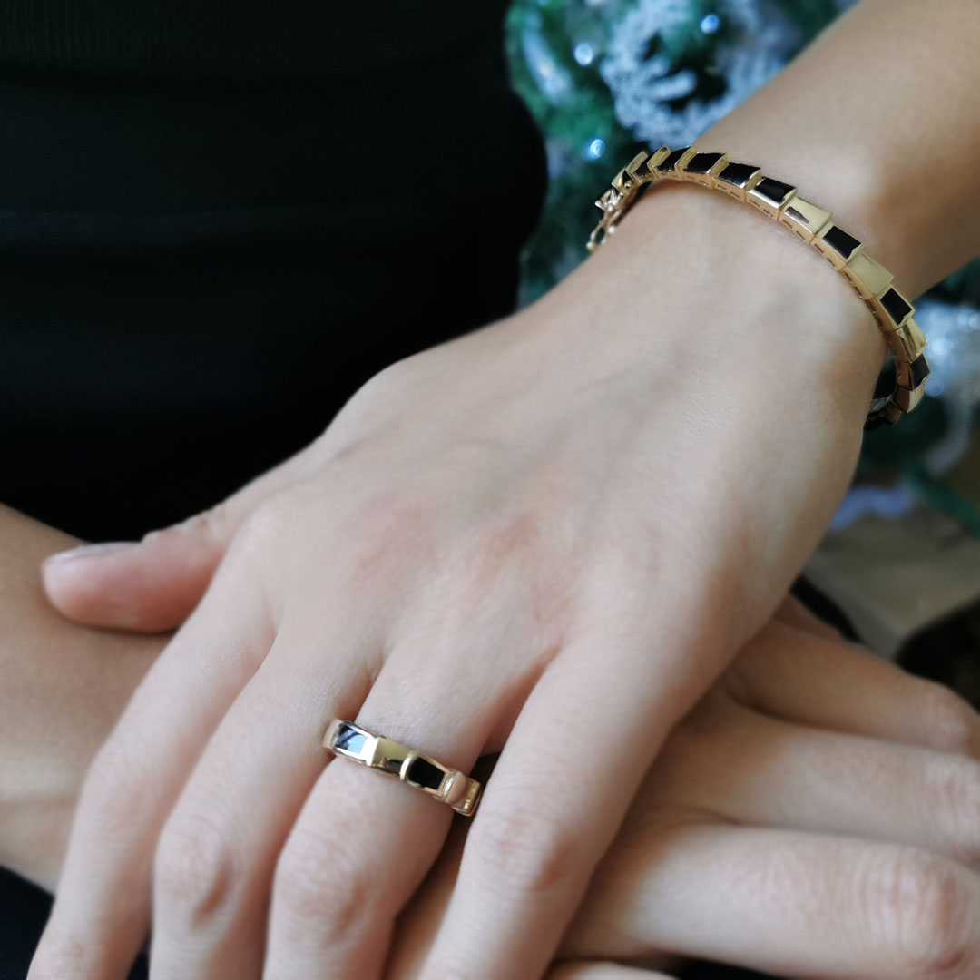 17.05 Gram Ağırlığında 14 Ayar Siyah Mine Detaylı Taşsız Altın Yılan Sırtı Yüzük, Küpe, Bilezik Takım.