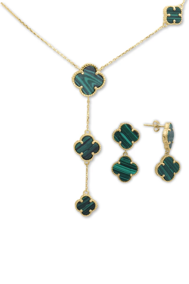 9.70 Gram Ağırlığında Yonca Yeşil Taşlı Parçalardan Tasarlanmış Modern Ve Şık Bir Duruşa Sahip 14 Ayar Altın Tasarım Kolye Küpe Takım.