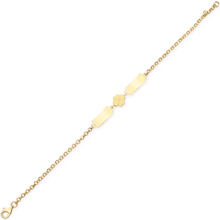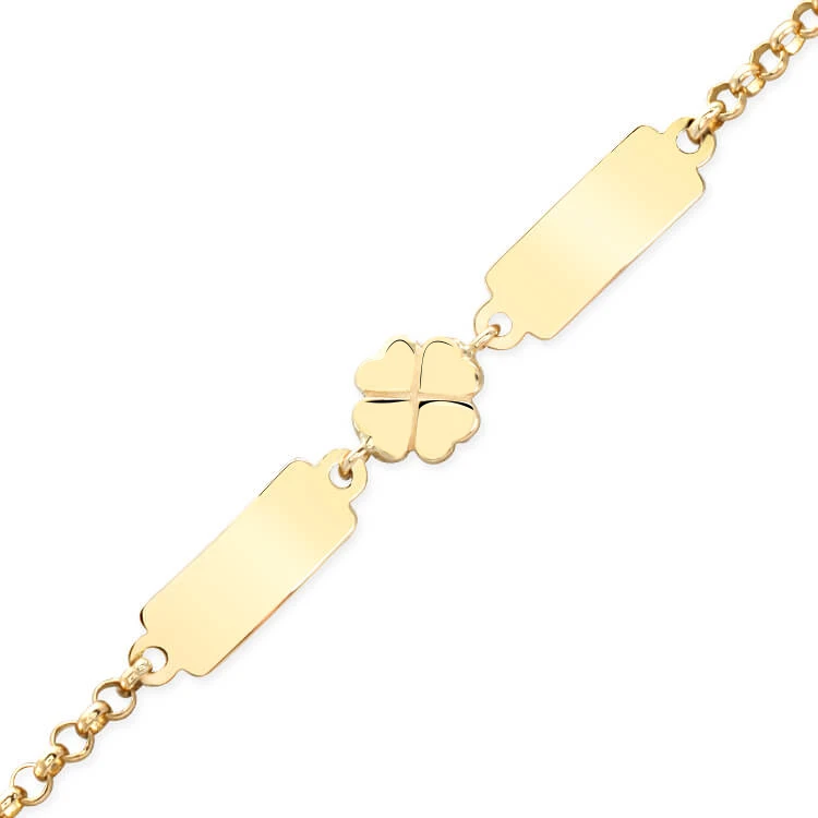 14 Cm boyunda günlük olarak da kullanıma uygun halka zincirli 14 ayar 2.5 gr ağırlığında altın yonca detaylı iki isimli çocuk künyesi. Modele ücretsiz olarak isim yazdırabilirsiniz, hem kız hem erkek bebek için kullanıma uygundur.