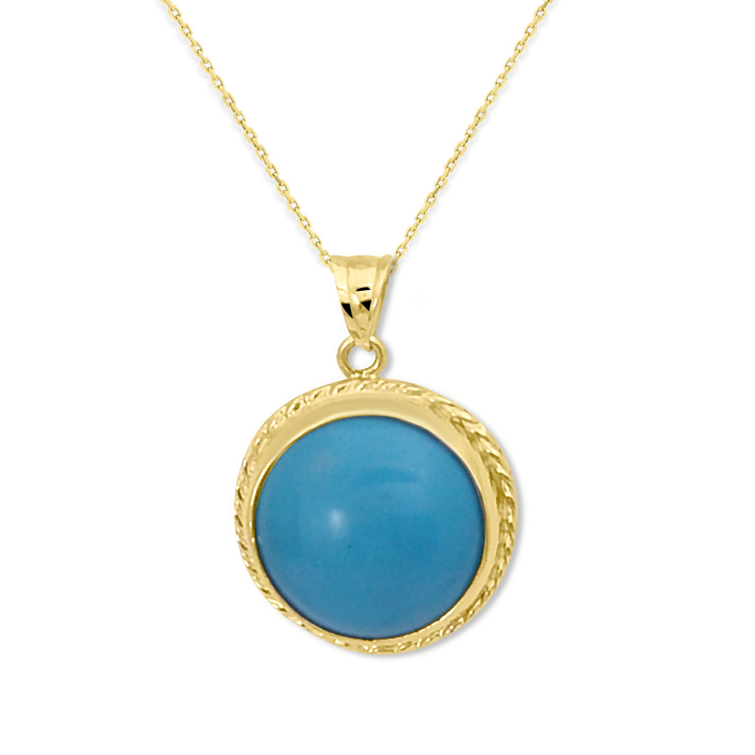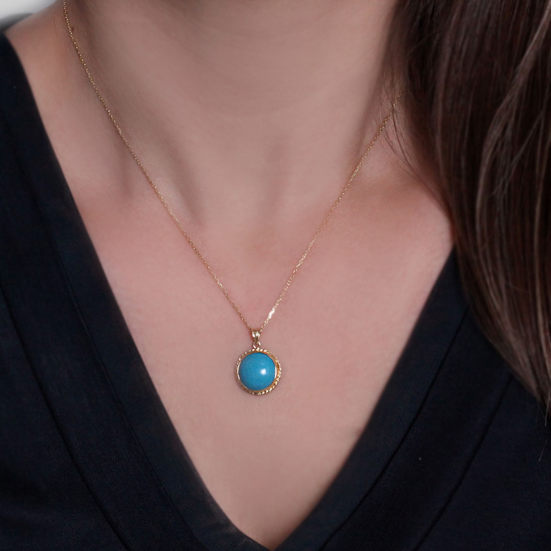 14 Ayar nostalji tasarımına eşlik eden yuvarlak firuze taş detaylı şık ve ışıltılı tasarımlara düşkün kadınların severek kullanacakları elegan duruşa sahip günlük kullanıma uygun 3.90 gram ağırlığında altın kolye. -Modeli dilerseniz zincirsiz, dilerseniz farklı zincir boyları ile de satın alabilirsiniz.