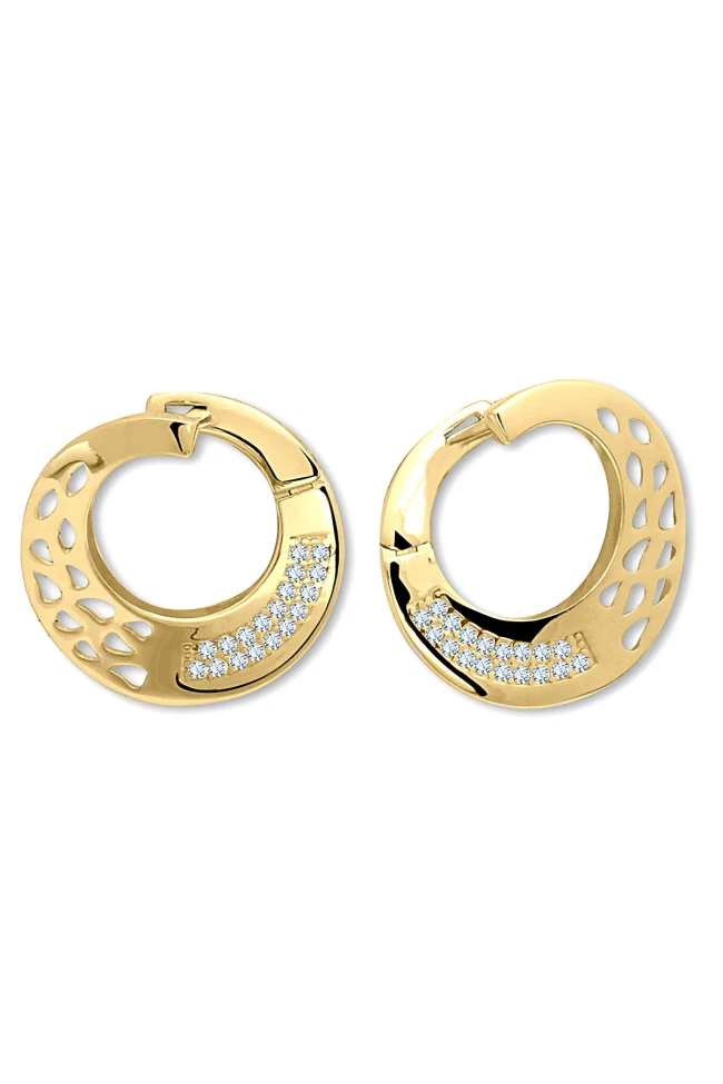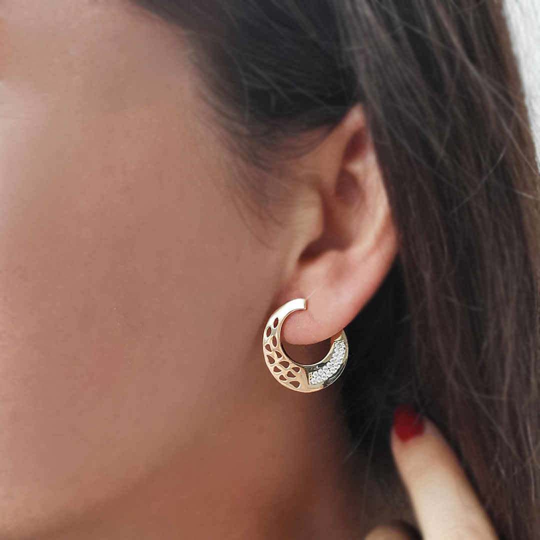 4.60 Gram Ağırlığında 2.2 Cm Boyunda Halka, Yuvarlak Üzeri Motif Ve Taş Detaylı 14 Ayar Altın Modern Tasarım Fantazi Kadın Küpesi. Günlük kullanıma uygundur, tüm giyim tarzınıza muhteşem uyum sağlar.