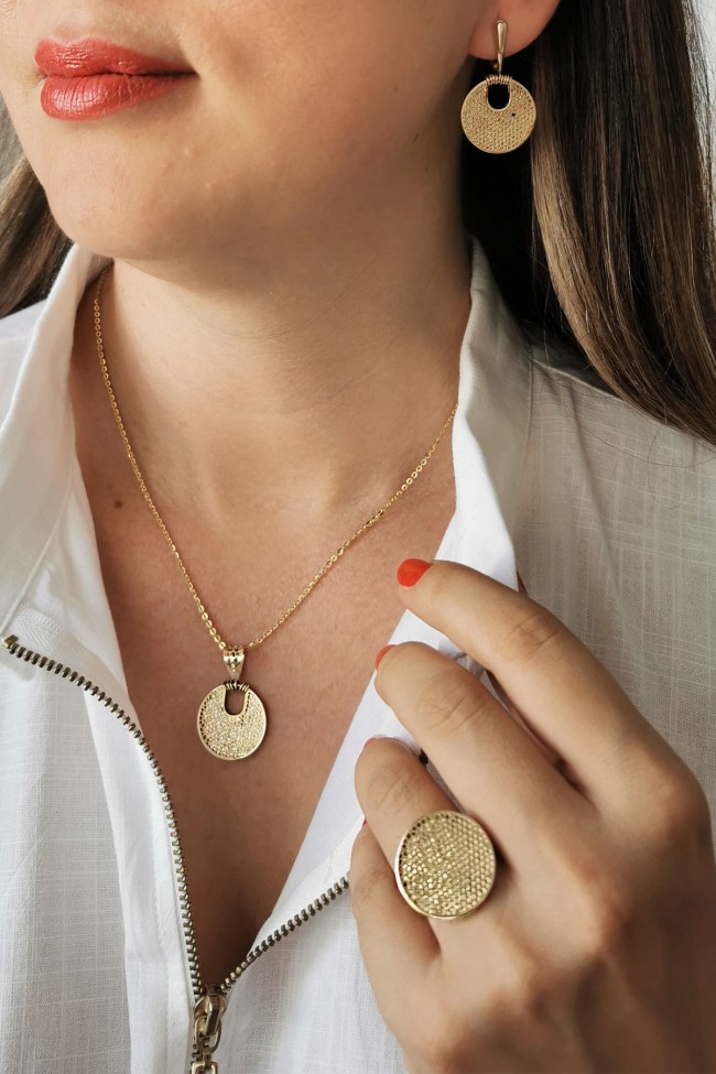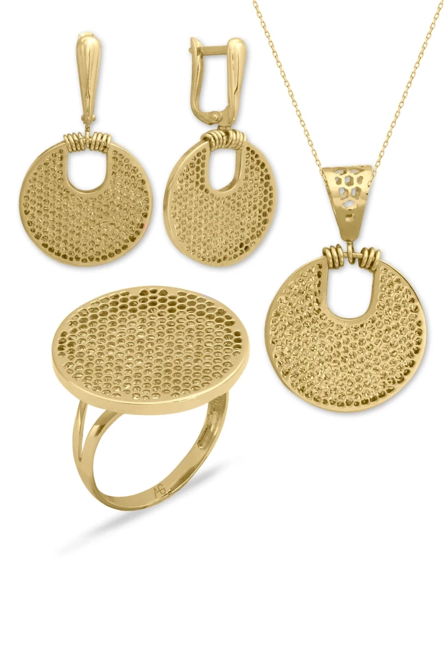 14 Ayar günlük kullanıma da uygun farklı tasarımlar ile güne imzasını atmayı seven kadınlara özel bir modele sahip tüm kombinlerinize eşlik edecek 16.25 gram ağırlığında altın taşsız petek tasarımlı ışıl ışıl üçlü takım.