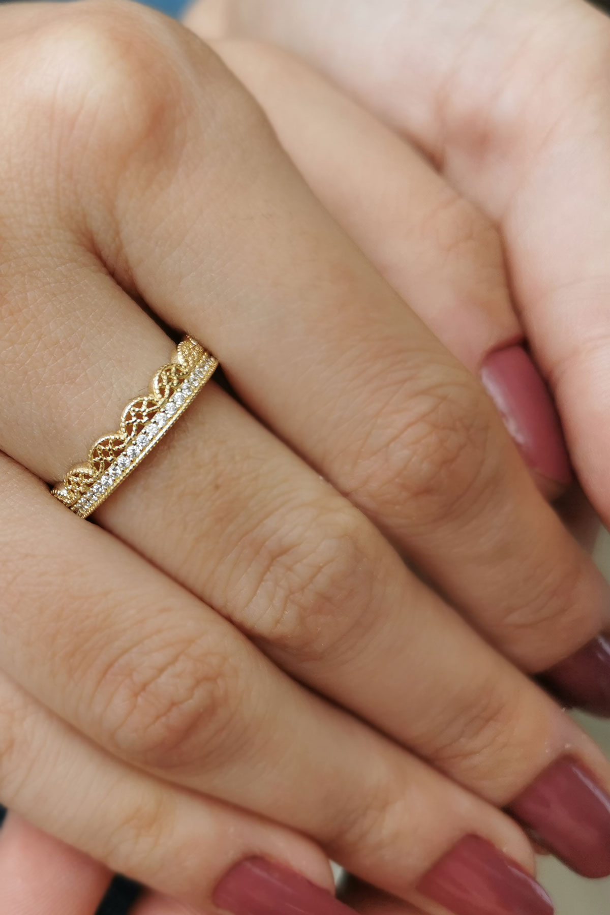 Zarif model 14 ayar sarı altın tasarımıyla günlük kullanıma uygun 2.15 gram ağırlığında ışıltılı taş detaylı taç kadın yüzük.