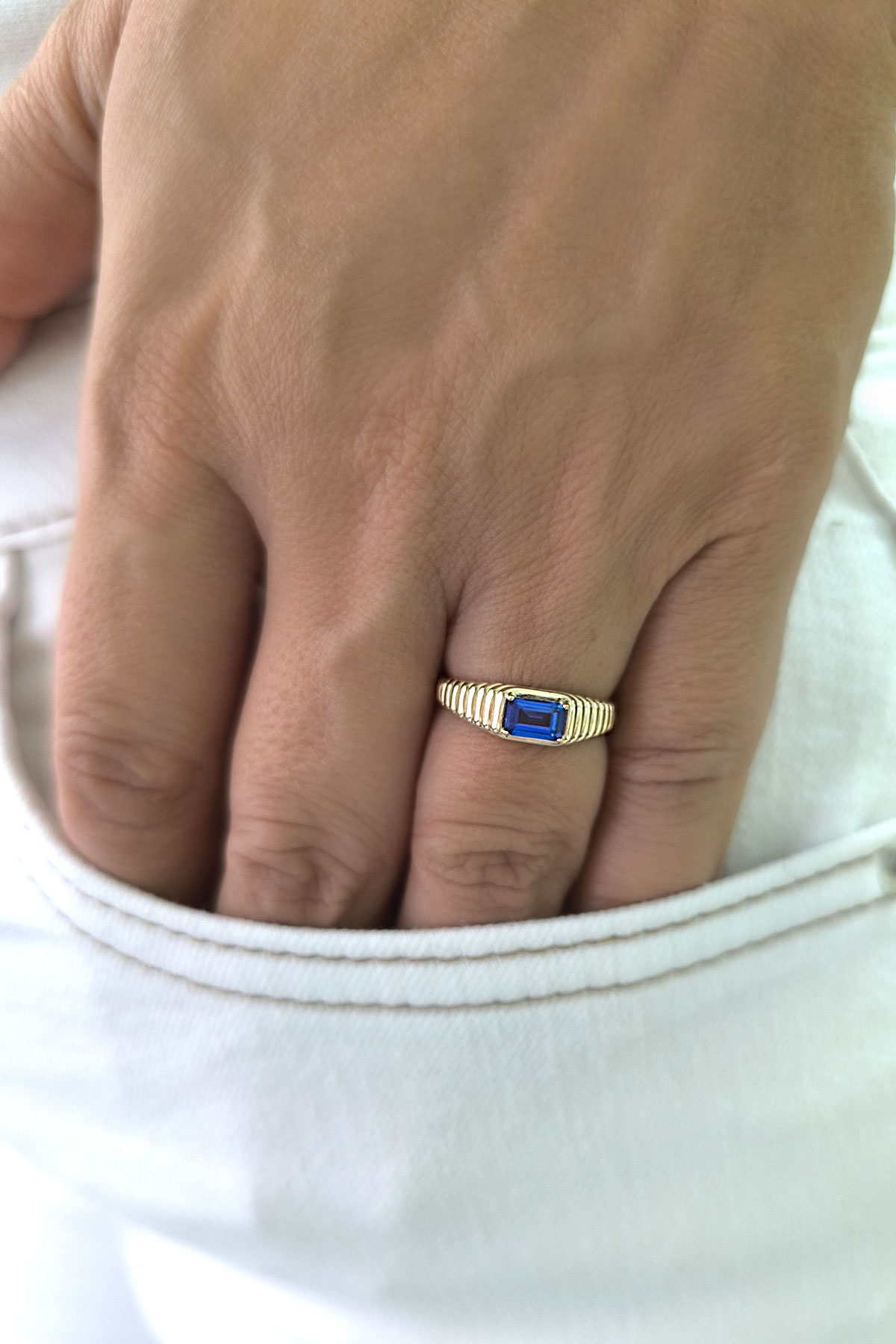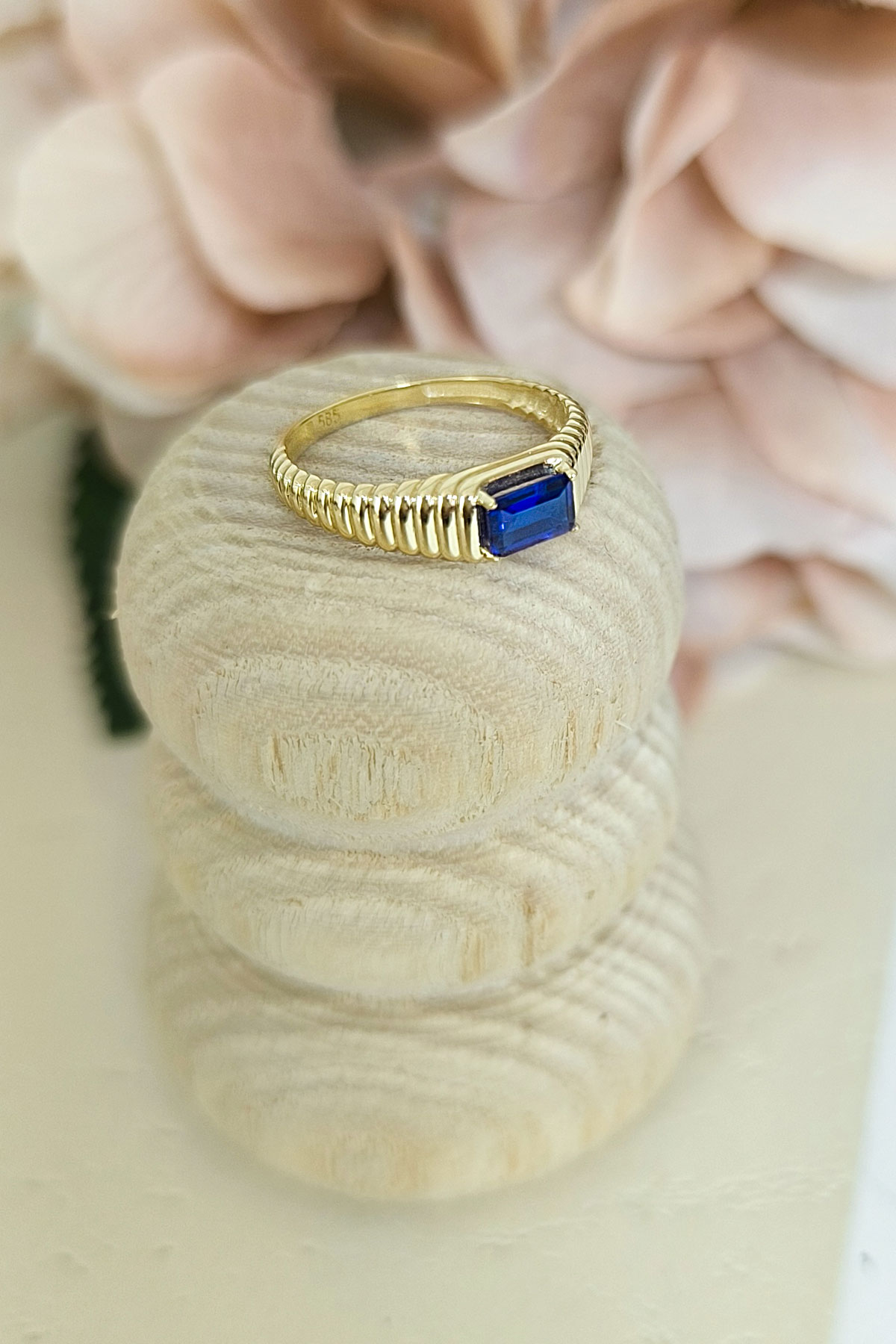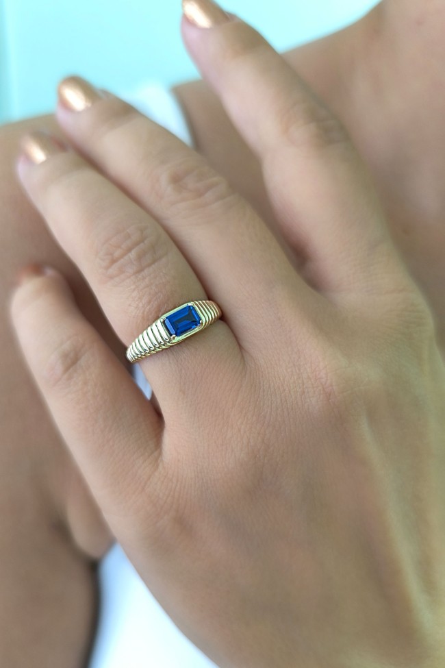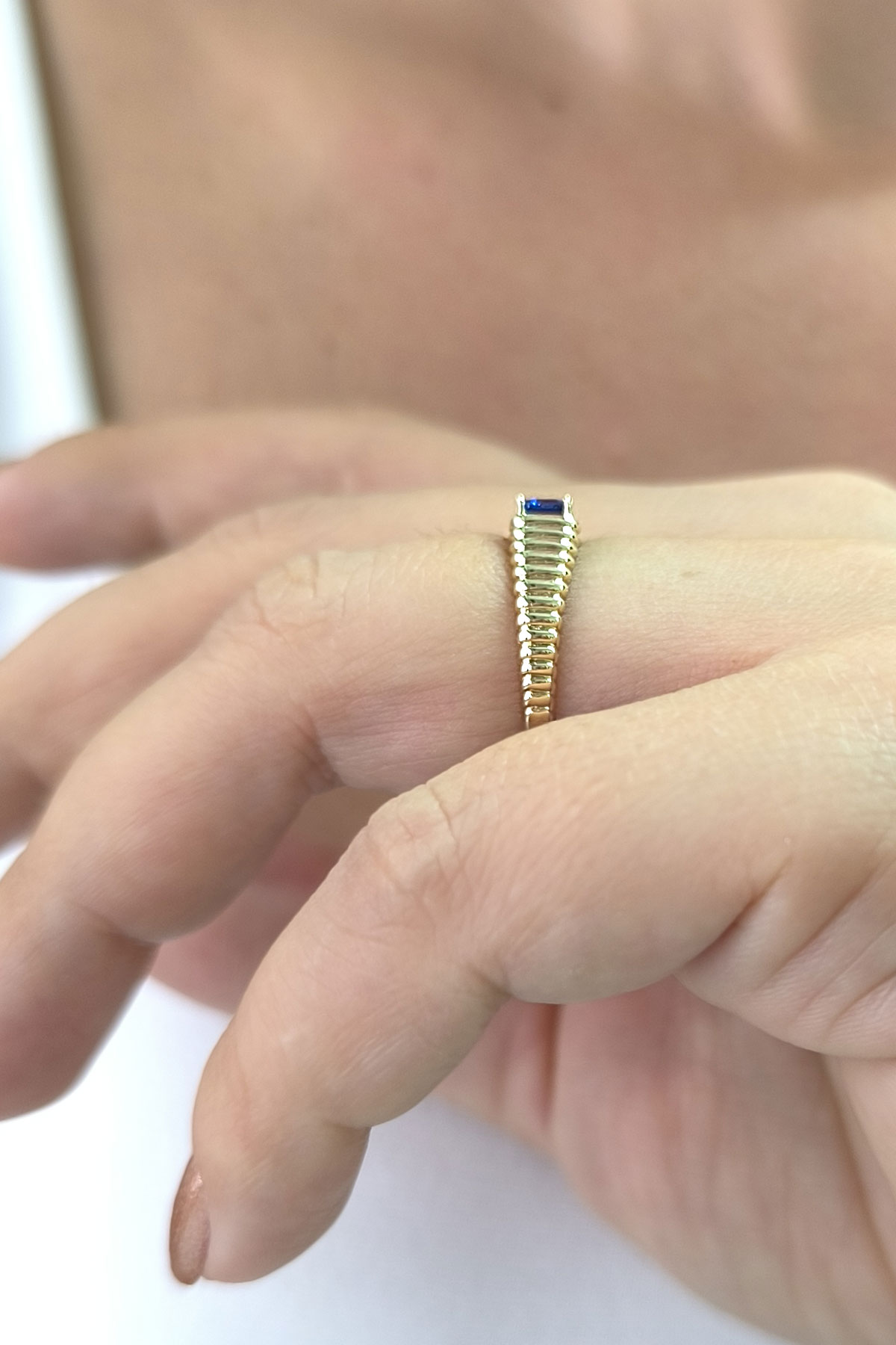 14 ayar sarı altın sade tasarımıyla günlük kullanıma uygun parmağınızda stilinize hava katacak 2.05 gram ağırlığında zirkon safir baget taşlı modern tasarım midye yüzük.