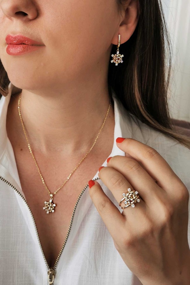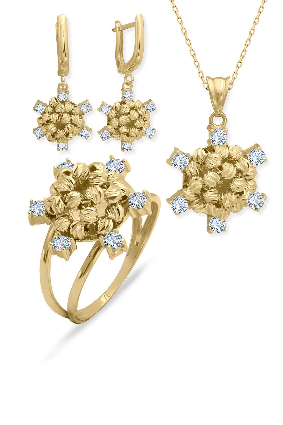 12.30 Gram Ağırlığında Zirkon Taşlı Işıl Işıl Kartanesini Andıran Şık Tasarımıyla Göz Dolduran 14 Ayar Altın Küpe Yüzük Kolye Takım.
