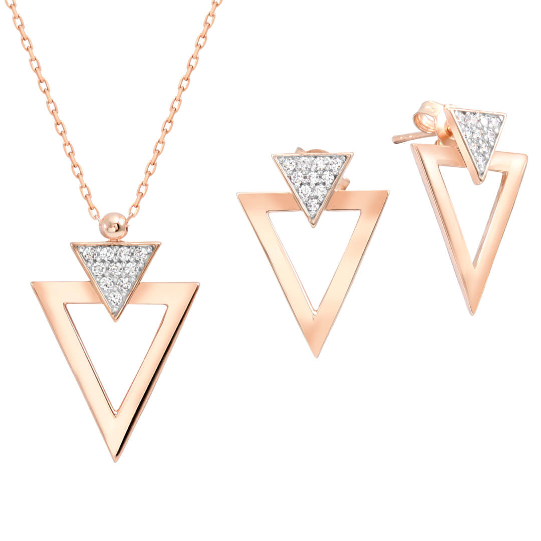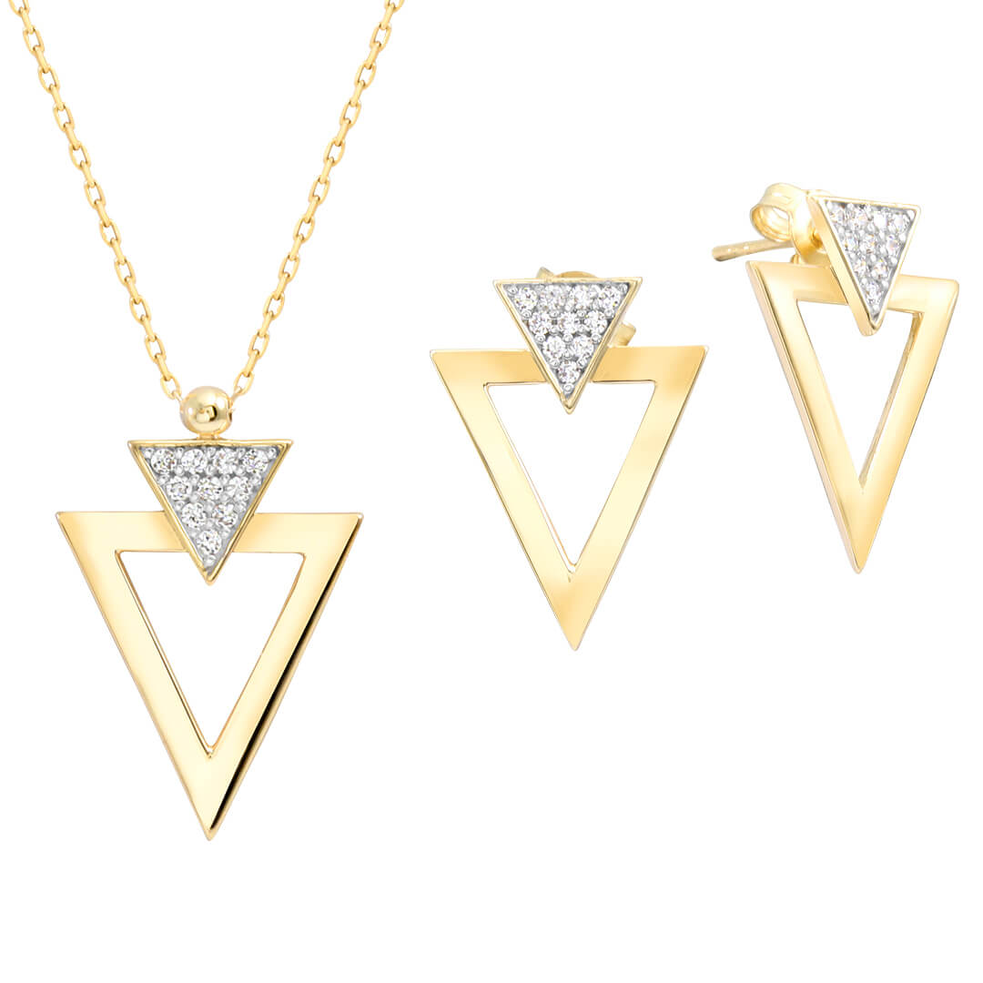 4.20 gram 14 ayar altın üçgen kolye ve küpeden oluşan takımı gündelik tarzınıza ışıltı katacak vazgeçilmez bir aksesuar olarak severek kullanacaksınız. Hafif ve sade bir duruşa sahip zirkon taşlı ikili altın takım ile sende stilini yansıt!