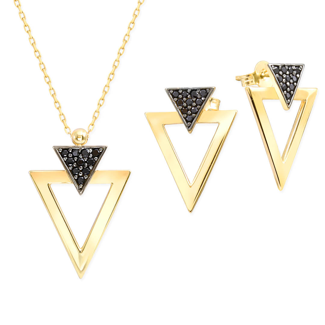 4.20 gram 14 ayar altın üçgen kolye ve küpeden oluşan takımı gündelik tarzınıza ışıltı katacak vazgeçilmez bir aksesuar olarak severek kullanacaksınız. Hafif ve sade bir duruşa sahip siyah zirkon taşlı ikili altın takım ile sende stilini yansıt! *Ürünleriniz özel hediye kutusunda garanti belgesi ve ücretsiz sigortalı kargo ile gönderilmektedir, güvenle satın alabilirsiniz.