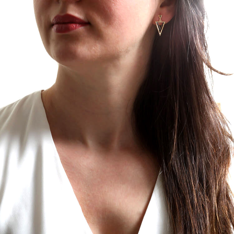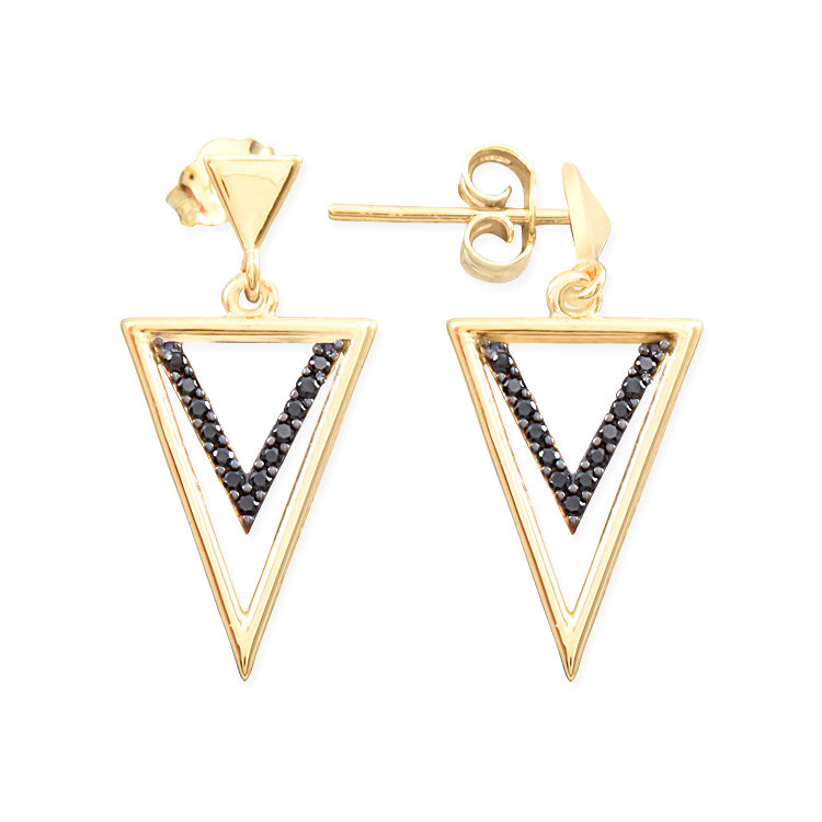 14 Ayar altın 2.4 cm boyutunda 1.90 gram ağırlığında günlük kullanıma uygun spor ve minimal tasarımı ile oldukça sade bir tasarıma sahip siyah zirkon taş detaylı spor üçgen küpe.