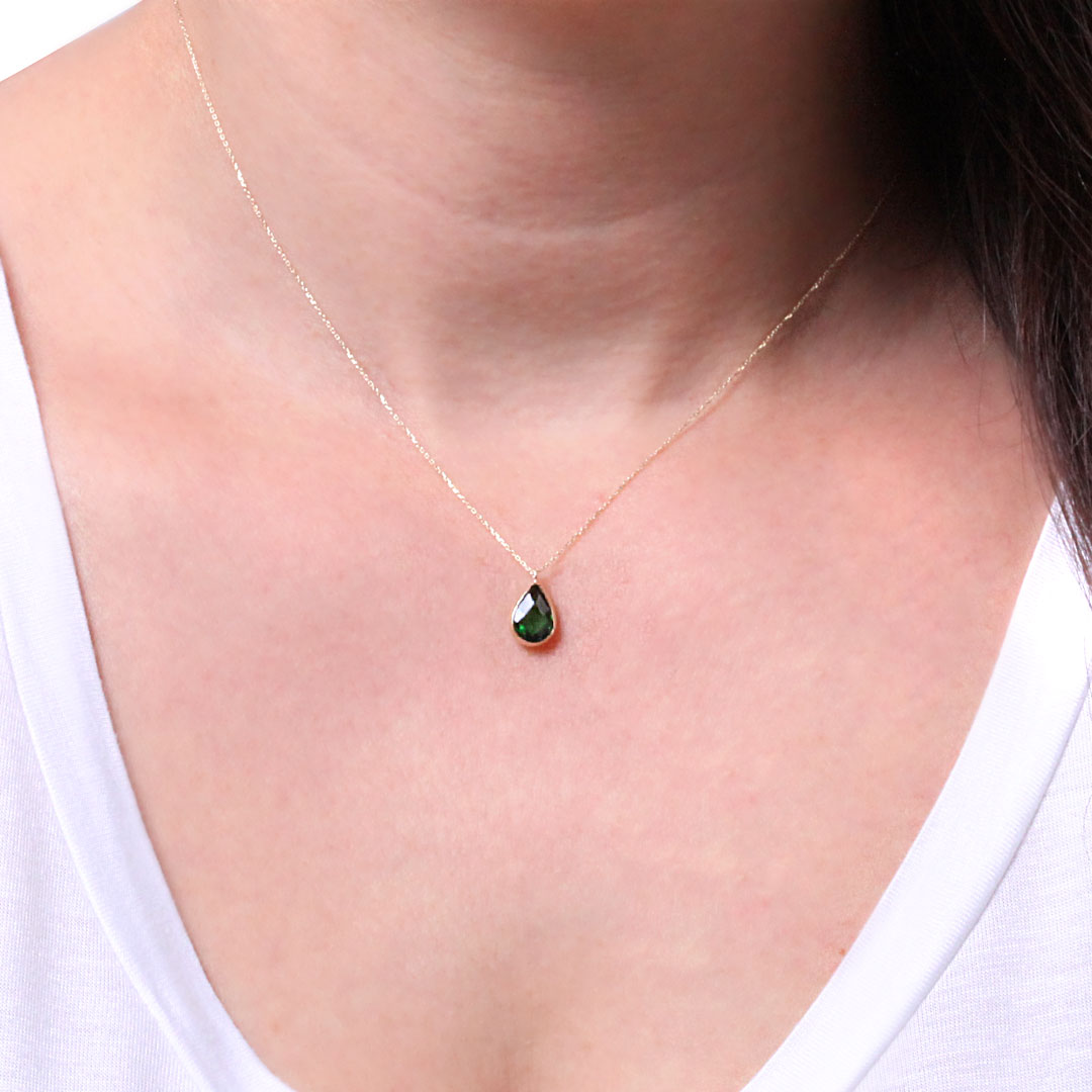 Yeşil (zirkon zümrüt) taşlı minimal tasarımları sevenlere özel hayalet zincir detaylı altın spor günlük kullanıma uygun kolye. Model taş boyutu 1 cm olup zincirli olarak 1.25 gram ağırlığındadır.