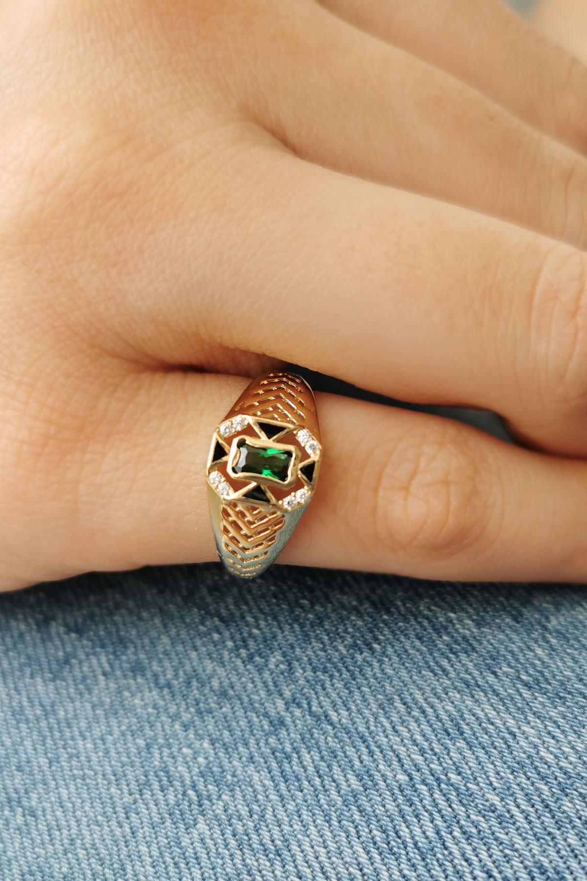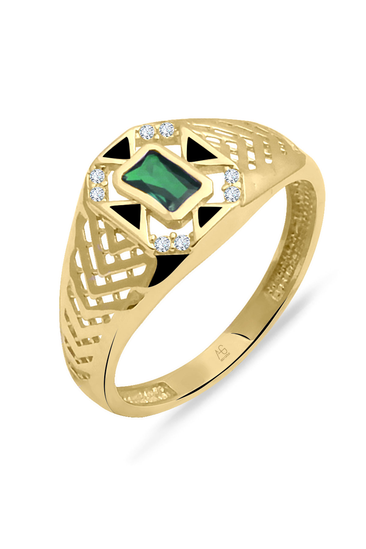 14 ayar sarı altın trend tasarımıyla günlük kullanıma uygun parmağınızda stilinize hava katacak 1.75 gram ağırlığında siyah mine detaylı zirkon zümrüt baget taşlı serçe parmak yüzüğü olarak da kullanıma uygun modern tasarım yüzük.