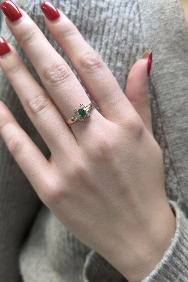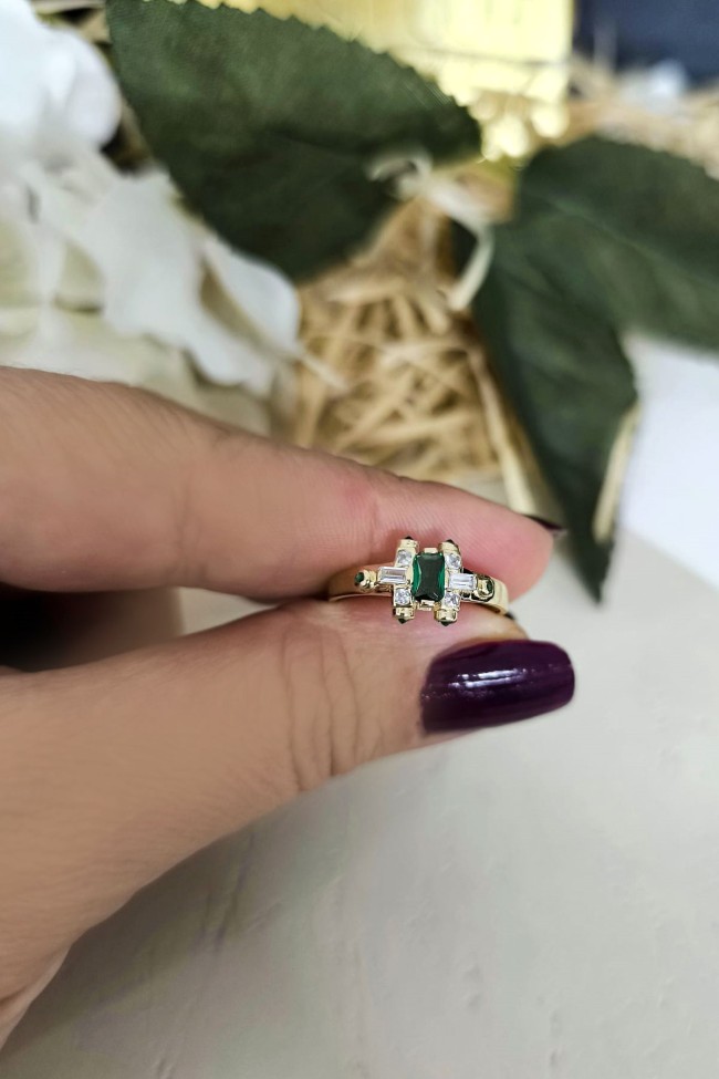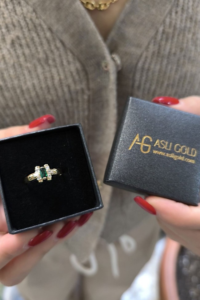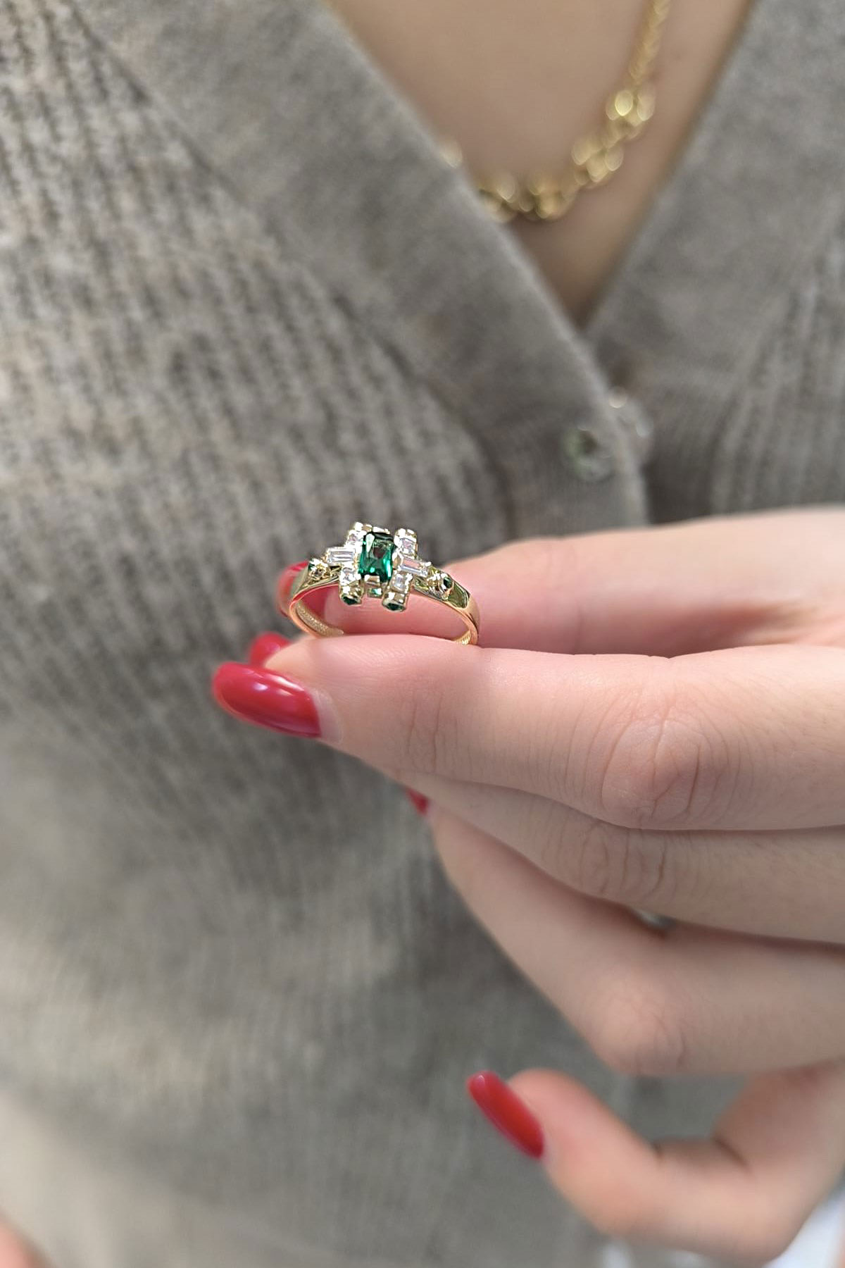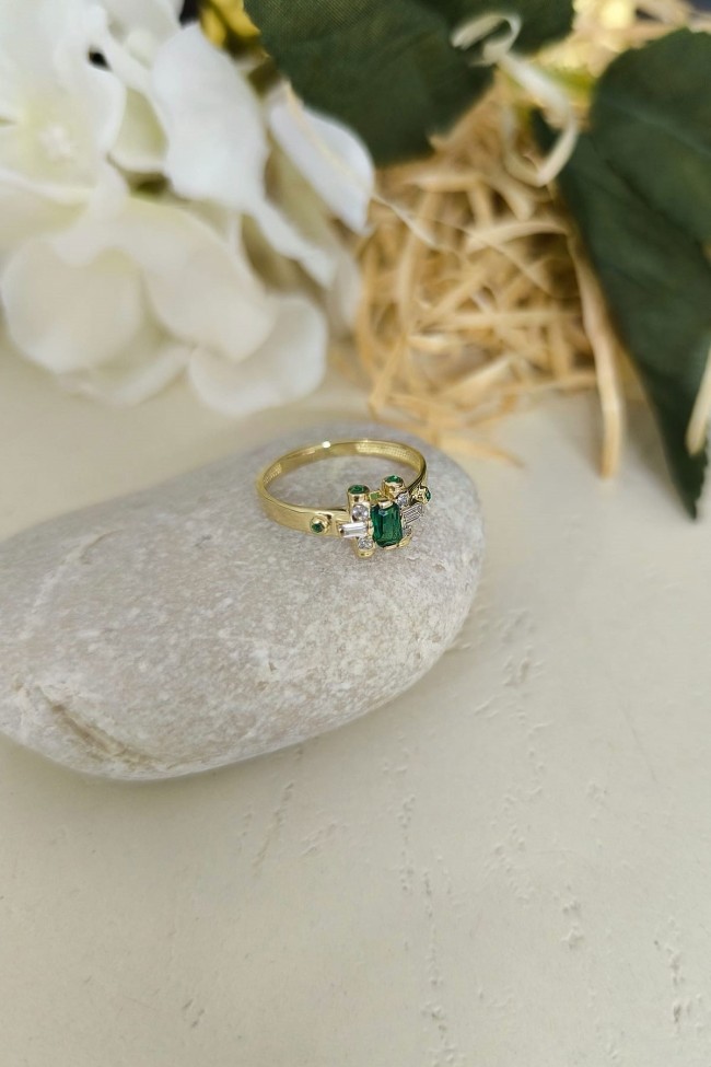 2.10 Gram Ağırlığında Zirkon Zümrüt Baget Taşı İle Oldukça Hoş Bir Havaya Sahip, Farklı Otantik Tarzı Olan Günlük Kullanıma Uygun 14 Ayar Altın Kadın Yüzük.