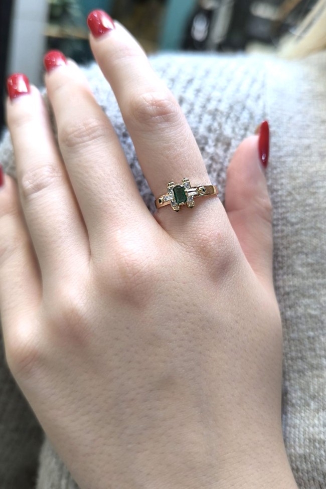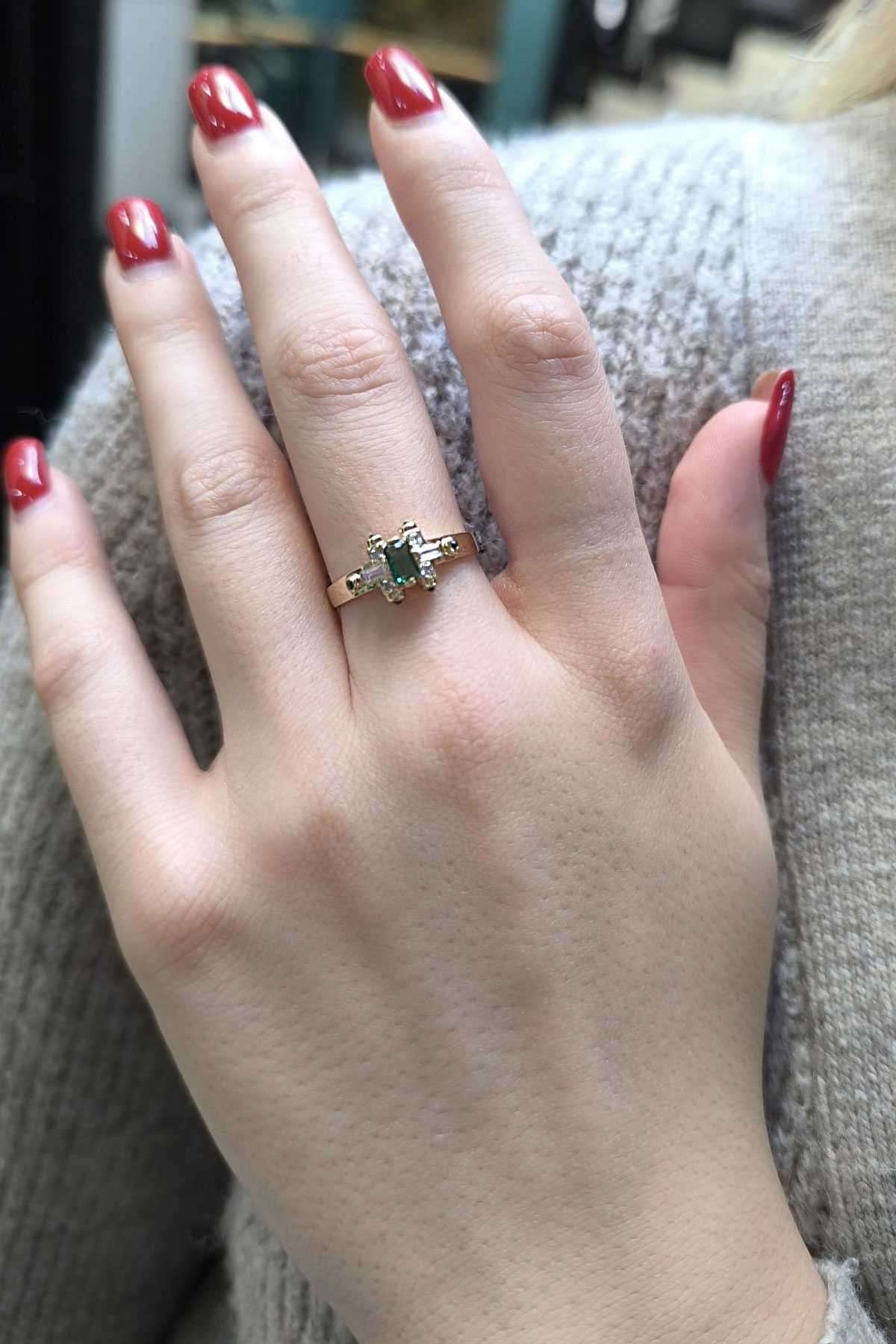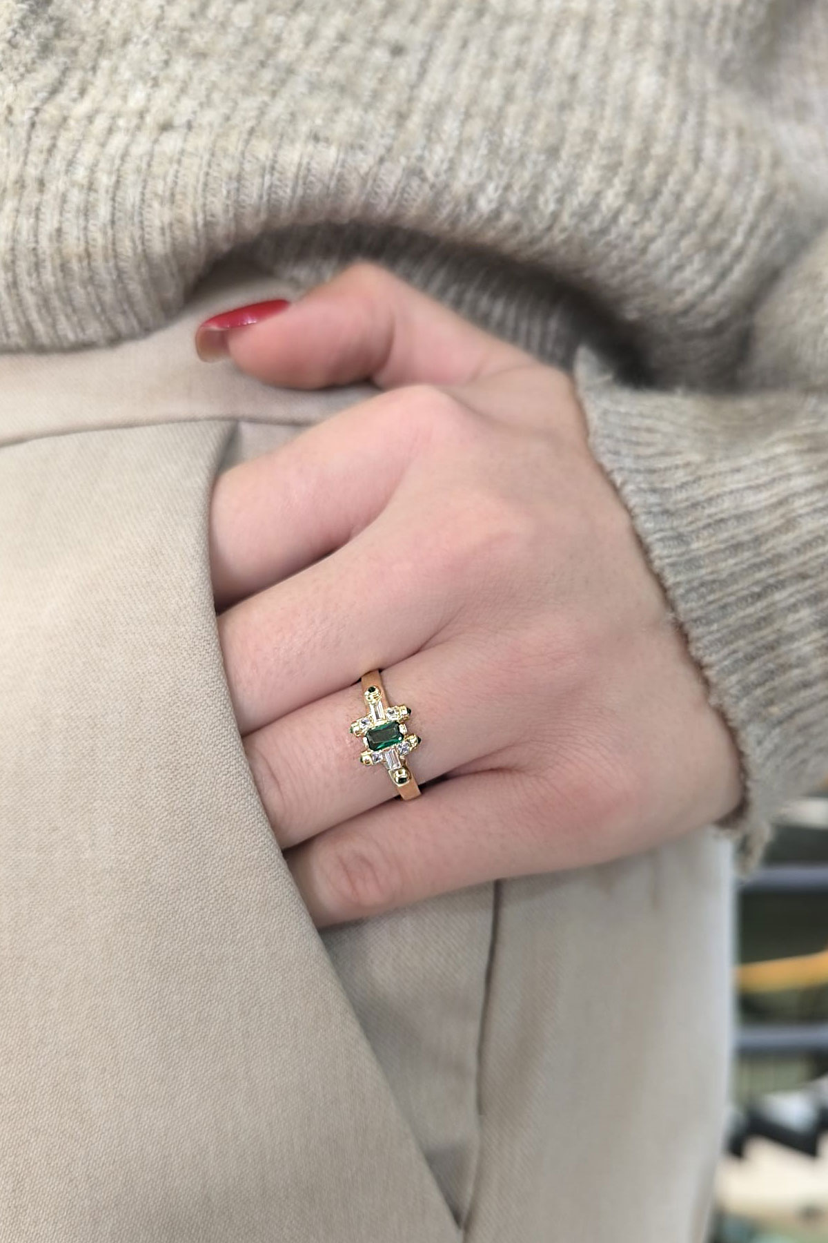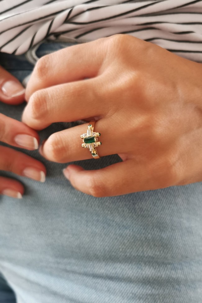 2.10 Gram Ağırlığında Zirkon Zümrüt Baget Taşı İle Oldukça Hoş Bir Havaya Sahip, Farklı Otantik Tarzı Olan Günlük Kullanıma Uygun 14 Ayar Altın Kadın Yüzük.